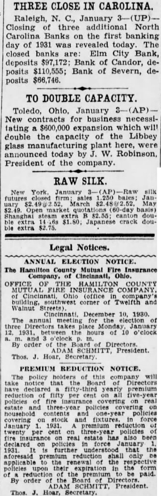 THREE CLOSE IN CAROLINA. Raleigh, N. C., January 3-(UP)Closing three additional North Carolina Banks on the first banking day of 1931 was revealed today. The closed banks Elm City Bank, deposits $97,172; Bank of Candor, deposits $110,555; Bank of Severn, deposits $66,746. TO DOUBLE CAPACITY. New contracts for business necessitating $600,000 expansion which will double the capacity of the Libbey glass manufacturing plant here, were announced today by J. W. Robinson, President of the company. RAW SILK. January Japanese crack ANNUAL ELECTION NOTICE. The Hamilton County Mutual Fire Insurance OFFICE HAMILTON COUNTY (office corner Twelfth and Walnut December the o'clock Thos. REDUCTION NOTICE. will policies fire renewal paid. order President. J. Hoar, Secretary.