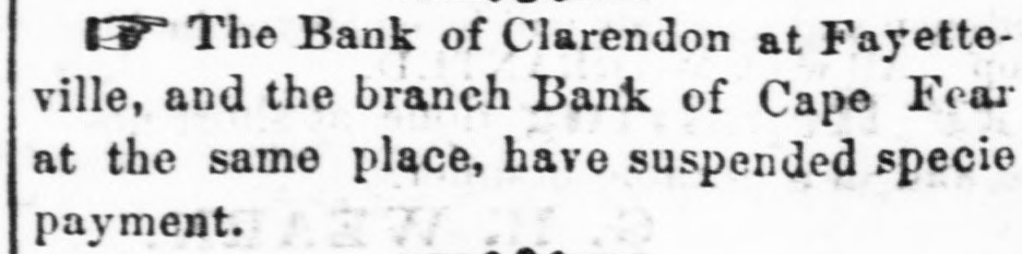 BANK SUSPENSIONS AT THE SOUTH. VIRGINIA.-The "Bank of Virginia" suspended specie payments yesterday. It was the last to yield in the present crisis, though holding out only about twenty-four hours longer than the other banks of this city. We may now say that all the banks in Virginia have suspended specie payments.-Richmone Enquirer of Thursday. NORTH CAROLINA.-The confirmation of the deplorable financial affairs in New York, where the main resources of the banks and merchants of this place are located and now locked up, has been the means of driving three of the banks of the town of Wilmington into a suspension of specie payments. The branch of the Bank of the State, located here, yet stands unsuspended, awaiting advices, we presume, from the mother bank at Raleigh. All the rest-the Bank of Wilmington, the Bank of Cape Fear, and the Commercial Bank of Wilmington-suspended this morning. We have a report that the Bank of Clarendon, at Fayetteville, suspended yesterday. We do not give this information as reliable. But we think, from the present appearance of things, that there will be a general suspension of the banks throughout the State.- Wilmington Journal of Thursday.