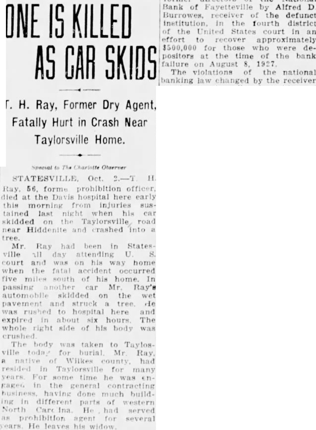Bank of Fayetteville by Alfred D Burrowes, receiver the defunct ONE IS KILLED institution. the fourth district of the United States court in an effort to recover approximately $500,000 for those who were depositors at the time of the bank AS CAR SKIDS failure on August 1927 The violations of the national banking law by the receiver T. H. Ray, Former Dry Agent, Fatally Hurt in Crash Near Taylorsville Home. H died at the hospital here early this sustained last night his car skidded Taylorsville road near Hiddenite and crashed into tree. Mr Ray had been in States ville all day attending U court and was on his way home when the fatal accident occurred five south of his home. In passing car Mr. Ray's automobile skidded on the wet pavement and struck tree de was hospital here and expired in about hours The whole right side of his body was crushed The body was taken to Taylos ville today for burial Mr Ray native Wilkes had resided Taylorsville for many For he in done building different western North Ina He had served prohibition agent several He his widow