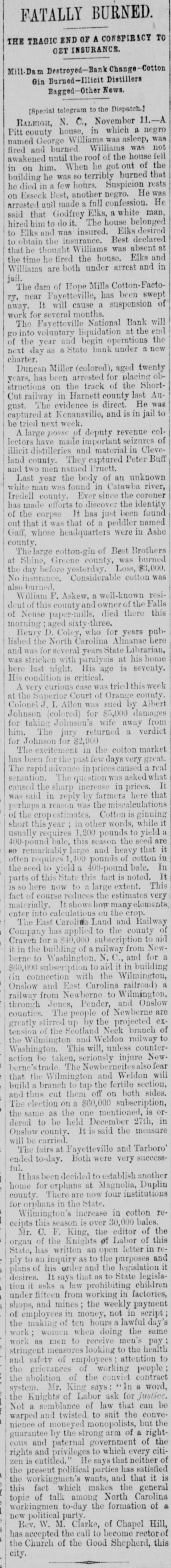 Gin Bagged- Other News. [Special telegram to the Dispatch.1 N. C., November 11.-A house, in which a Williams was asleep, was and burned was fell named fired Pitt RALEIGH, county George Williams house negro not awakened until the roof of the of the on him. When he got out that in he was so terribly burned rests building in a few hours. Suspicion Best, another negro. on and made a full he arrested died Esseck confession. white He man, was He said that Godfrey Elks, a belonged hired him to do it. The house desired Elks and was insured. Elks declared to obtain the insurance. Best at that to he thought Williams was absent and the time he fired the house. Elks in Williams are both under arrest and jail. The dam of Hope Mills Cotton-Facto near Fayetteville, has been swept of away. ry, It will cause a suspension work for several months. The Fayetteville National Bank end will into voluntary liquidation at the the go of the year and begin operations new next day as a State bank under a charter. Duncan Miller (colored), aged twenty ob has been arrested for placing structions years, on the track of the Short- AllCut railway in Harnett county last He gust. The evidence is direct. was to captured at Kenansville, and is in jail be tried next week. A large posse of deputy revenue col- of lectors have made important seizures illicit distilleries and material in Cleve- Buff land county. They captured Peter and two men named Pruett. Last year the body of an unknown white man was found in Catawba river, Tredell county. Ever since the identity coroner has made efforts to discover the found of the corpse It has just been out that it was that of a peddler named Ashe Gaff, whose headquarters were in county. The large cotton-gin of Best Brothers burned Greene county, was at the Shine, day before yesterday. Loss, $3,000. was No insurance. Considerable cotton also burned. William F. Askew, a well-known Falls resident of this county and owner of the this of Neuse paper-mills, died there morning ;aged sixty three. Heury D. Coley, who for years published the North Carolina Alinanac here and was for several years State Librarian, home was stricken with paralysis at his here last night. His age is seventy. His condition curious is critical. case was tried this week at A the very Superior Court of Orange county. Albert Colonel J. I. Allen was sued by Johnson (colored) for $5,000 damages from for taking Johnson's wife away verdict him. The jury returned a for Johnson for $2,900 The excitement in the cotton market great. has been for the past few days very The rapid advance prices caused sensation. The question was asked It caused the sharp increase in prices. s a a d in reply by farmers here that reason was the miscalculations is in other words, requires 1,200 pounds to perhaps short of the this year cropestimates. Cotton ginning while yield are bale, this it large and heavy in 80 1,400 pounds of often usually 00-pound remarkably requires season the bale. cotton seed that In the seed to yield 400-pound parts of this State this fact is noted. This It so here now to a large extent. fact is of course reduces the estimates elements very materially. It shows how many enter into calculations on the crop. The East Carolida Land and county Railway of Company has applied to the to aid Craven for 840,000 subscription Newt in the building of railway from for a berne to Washington, N.C., and $60,000 subscription to aid it in building (in connection with the Wilmington, railroad) a Onslow and East Carolina railway from Newberne to and Wilmington, Onslow through Jones, The people Pender, of Newberne are counties. stirred up by the projected ex- of greatly of the Scotland Neck branch to tension the Wilmington and Weldon railway Washington. This will, unless counter- Newaction be taken, seriously injure also fear berne'strade. The Newberneites will the Wilmington and Weldon that build a branch to tap the fertile both section, sides. and thus cut them off on The election on a $60,000 subscription, is orthe same as the one mentioned, in dered to be held December 27th, measure It is said the Onslow county. will be carried. The fairs at Fayetteville and Tarboro successended to-day. Both were very ful. It hasbeen decided to establish another Duplin home for orphans at Magnolia, institutions county. There are now four for orphans in the State. Wilmington's increase in cotton rethis season is over F. King, the editor Knights of ceipts Mr. of C. the 30,000 Labor bales of of this the has written an open ply to All inquiry as the legislation it State State, plans organ of his It says order that and to as the to purposes letter children legisla- in and desires. tion it asks a law prohibiting factories, under fifteen from working in and mines the weekly payment shops, in money, not in script of employees of ten hours a lawful day work the making women when doing the same pay receive men's health measures looking to to safety of employees work and stringent as men to attention the people of working of the convict Mr. King says: In a system. the the abolition grievances for contract justice. word, Knights of Labor ask be semblance of law that can a and twisted to suit but the of moneyed warped Not the monopolists, the conve- rightby the strong arm of a of paternal government and privileges to which of eous guarantee rights nience and every neither citi- the entitled." He says that zen is political parties has it workingmen's wants, and general the the present the that satisfie is which makes of talk among North of a to-day the this topic workingmen political fact party. formation Carolina new Rev. W. M. Clarke, of Chapel Hill, of accepted the call to become rector this the has Church of the Good Shepherd, city.
