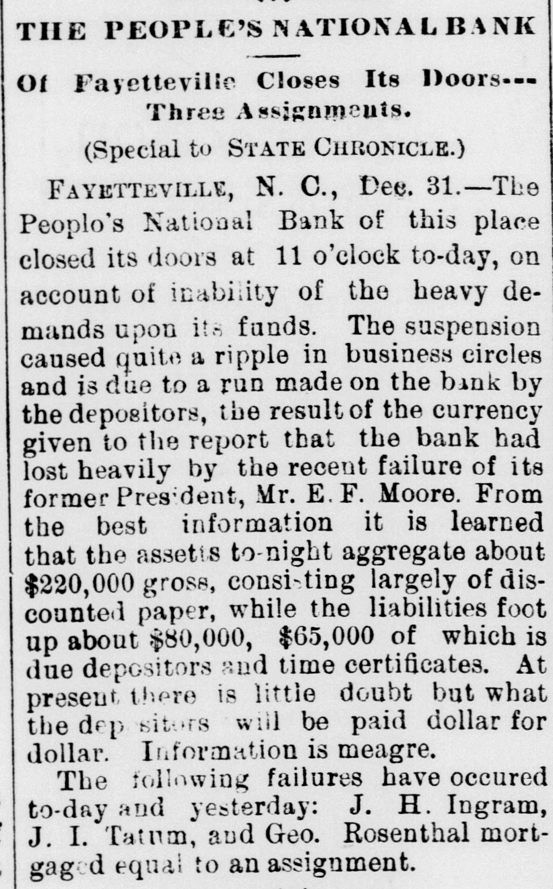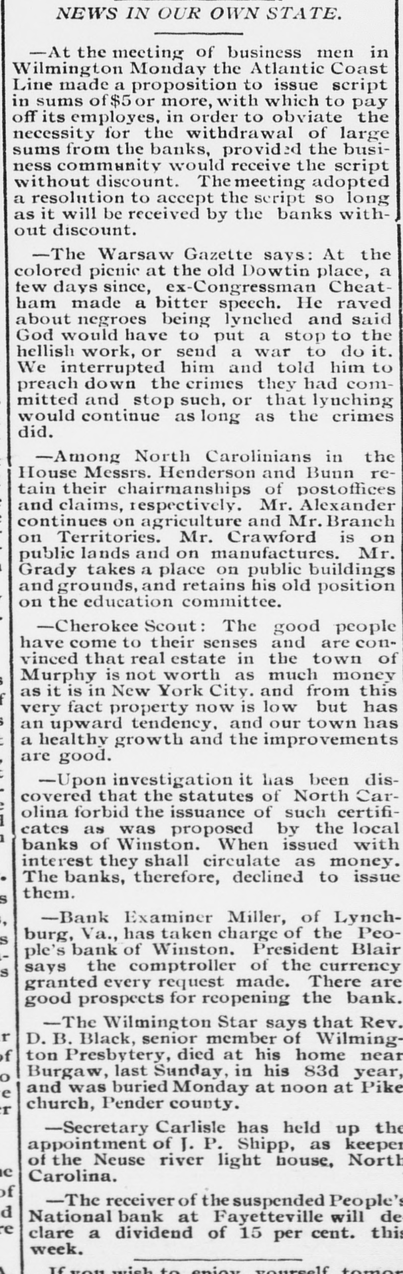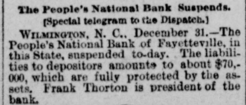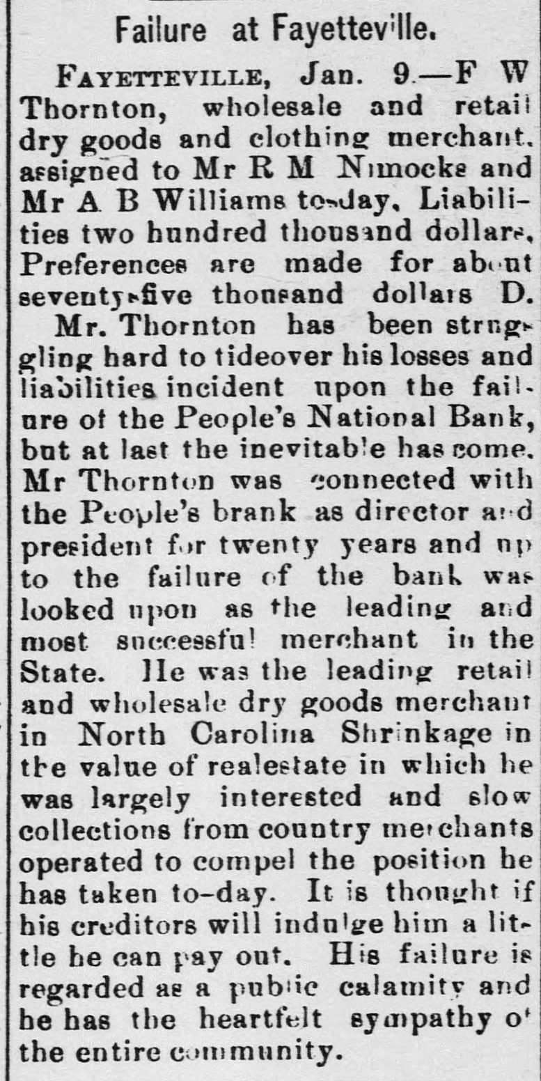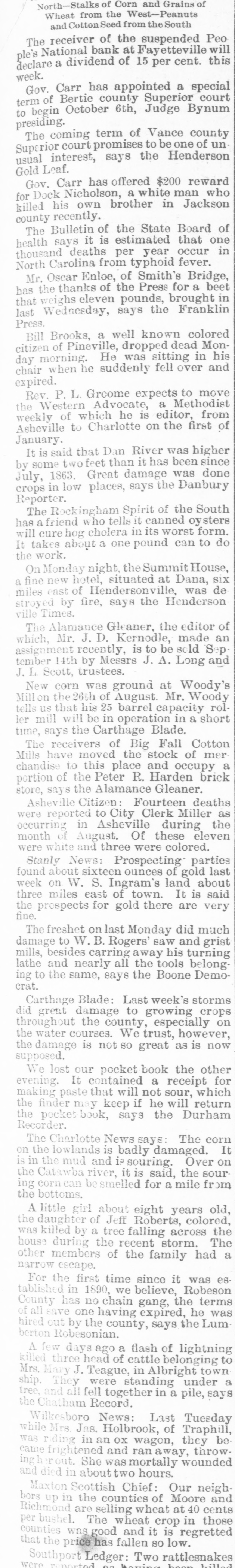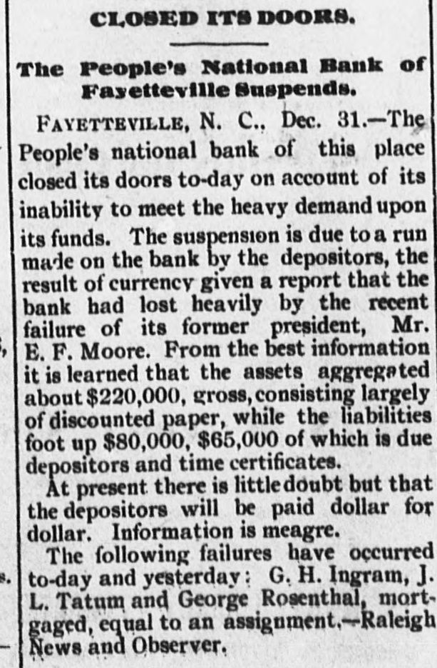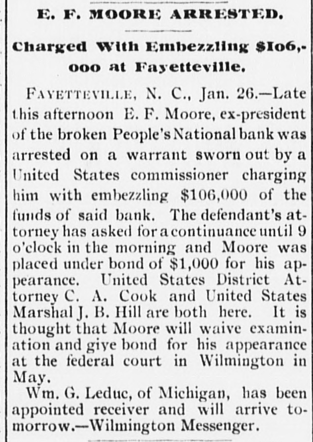 THE PEOPLE'S NATIONAL BANK CLOSE FOR $80,000. Grady Arrested for the Murder of HisWife-Seven Negro Children Roaster d Alive- War of Words Between Editors. North Carolina News. RALEIGH. N. C., Dec. [Special. A special from Fayetteville to-night announces that the People's National Ban OF that city closed its doors to-day on account of a heavy run made upon it. The run was caused by the failnee of the former president of the bank, E. F Moore, who recently resigned, and whose affairs are in bad condition. Th. liabilities are stated at $80,000. and the as sets $200,000. It is claime that the deposi tors will be paid dellar for dollar. and that the bank was closed so'ely 01 account of a run, which for a while looked paricky. The closing of the bank resulted in the failure of G.W. Ingram, J. L Taarm, and George Rosenthal, merchants of Fayetteville A NEW YEAR WEDDING To-morrow afternoon. in Edenton Street M E. chureb, in this city. Rev. J. D. Arnold of the faculty of Asheville Female College. of the most prominent ministers in the is estern North Carolina Conference. will be united in marriaze to Miss Nannie Clark of this city, sister of Associate Justice Walter Clark, of the North Carolina Supreme Court bench. GOVERNOR FOWLE IN HIS NEW HOME Governor Fowle to-day begun moving into the new Governor's Mansion, on Blount street, which is now completed. and which has been turned over to him by the State Public Buildi g Committee. WAR OF WORDS BETWEEN EDITORS. Editor Fairbrother of the Durbam Daily Globe, to-day replied to the attack made upon him vesterday by Josephus Daniels editor of the State Chronicle, in which Daniels referred to him as a coward and blackguard. Fairbrother's reply is very abusive of Daniels, and closes with in iting him t a personal settlement if he desires it, as be said, as his editorial intimates. KNIGHTS OF PYTHIAS BANQUET Last night the Knights of Pythias of this city held a grand banquet at which covers were laid for 125. After re'reshments were served speeches were made by his Honor A.A. Thompson. Captain E. R. Stamps, Grandsire C. M. Busbee, Joseph J. Bernard, Esq., Rev. George 1 underlid, George H. Snow, Esq.. and others. Mr. Hal W. Aver, late city editor of the Daily Chronicle of this city, left to-day for Washington, where be goes to take the position of private secretary to Colonel L. 1. Polk. president of the National Farmers' Alliance. DEPUTY COLLECTOR HAWKINS' SUCCESSOR E. A. White, collector of internal rever nue for the Eastern district of North Carolina, has appointed Benjamin Hawkins deputy collector of Vance, Franklin, and Warren counties, to succeed his father General Phil. B. Hawkins, who has resigned on account of illness. SEVEN CHILDREN ROASTED ALIVE A special from Bay boro, in Pamlico county, brings the blood-curdling news of the burning alive of seven negro children near that place Sunday night. A colored man named Scott Thompson, his wife and oldest child, who live five miles below Bayboro, went to church Sun. day night, leaving seven children, tive of them his own and two of them his grandchildren at home, their ages ranging from infancy to above tifteen years of age. Before the services were concluded it was discovered that their home was on fire, and the congregation made a rush for it. On nearing the scene of the conflagration the agonizing screams of the children could be plainly heard. but when the place was reached the building had fallen in, and every one of the inmates had perished in the flames. It is supposed that the tire aught in some way from the chimney, and spread rapidly, and all the children being sound asleep, did not awaken until the flames had cut off all egress. CHARGED WITH HIS WIFE'S MURDER Tilla J. Grady and his daughter-in-law were brought here to-day from Millbrook, in this county, and committed to jail, charged with the murder of Grady's wife by poisoning last week. Grady is about sixty years old and his daughterin-law is about twenty-two, and has a child only a few months old. Grady and wife have not lived happily together for many years. and she has Ire. quently had Grady arrested and before courts for squalt and battery upon ber. Since her son married he and his wife have been alivingwith Gradv The elder Mrs.Grady has imagined that her husband and her daughted-in-law saw too much of each other, and this has caused Tilla Grady's of wife to become intensely jealous her husband and her daughter-inlaw. On Monday of last week the four in family took breakfast together, and very soon atterwards Mrs. Tilla Grady was taken violently ill with symptoms that indicated menical poisoning and died in four hours. Her husband had left home as soon as be finished break. fast, and was not there when his wife died. The deceased declared from the time she was taken ill till she died that her husb and and daughter had poisoned her by putting something in the coffee which she drank. The coroner has for sev. eral days been holding an inquest, and the evidence was found to be sufficient for to hold the accused parties action by the grand jury. The body of Mrs. Grady has not been exbumed, but will be, and a post-mortem examination will be held at once. The family are well-known, and the affair creates great interest.