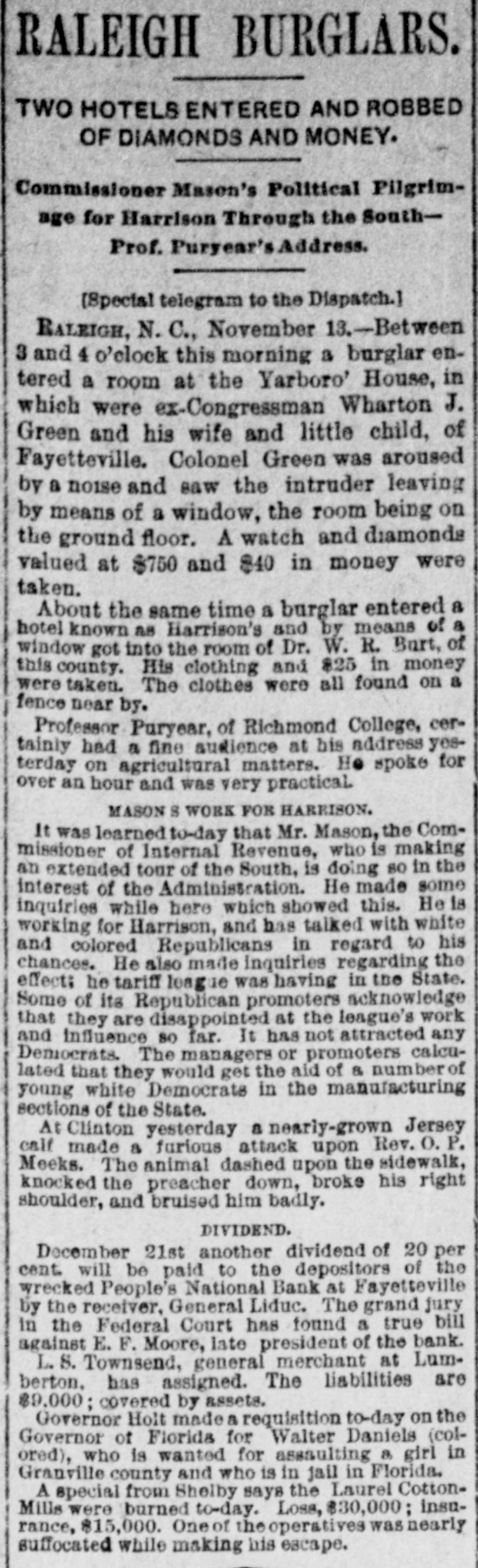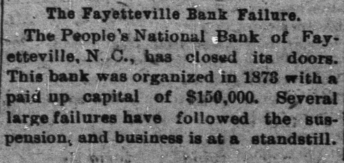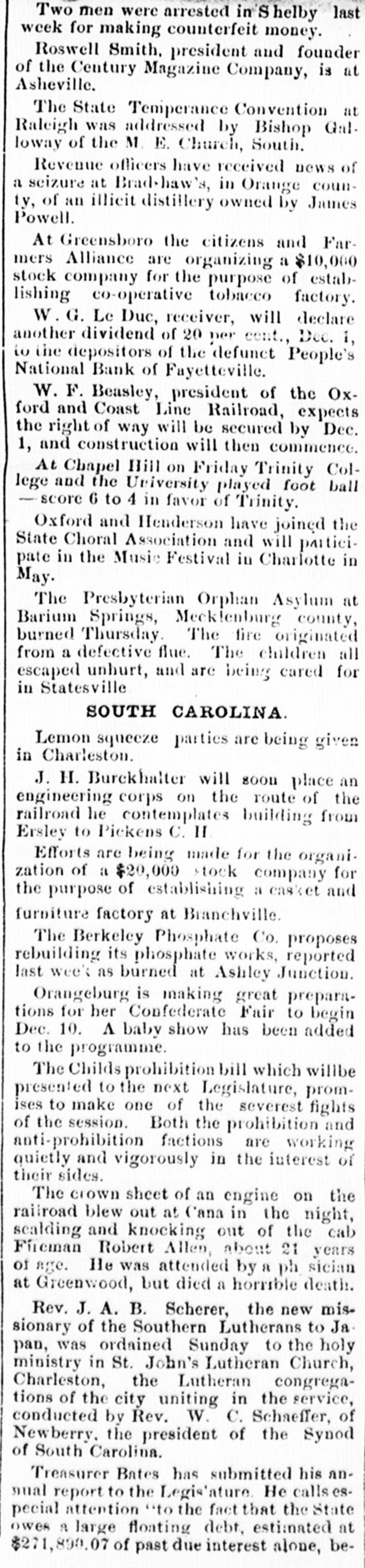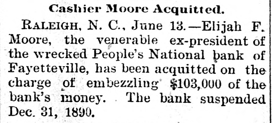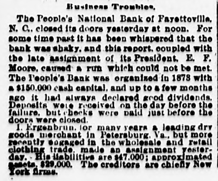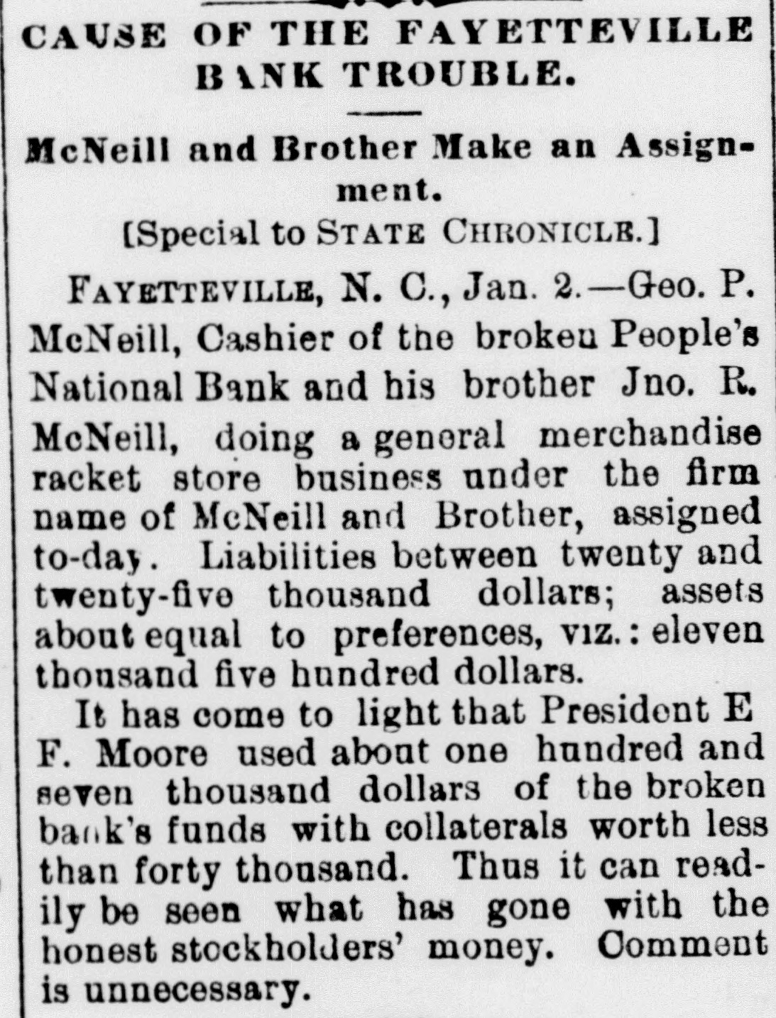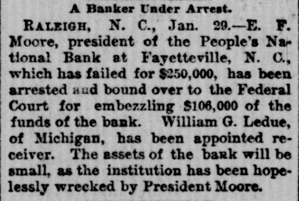 THE PEOPLE'S NATIONAL BANK CLOSE FOR $80,000. Grady Arrested for the Murder of HisWife-Seven Negro Children Roaster d Alive- War of Words Between Editors. North Carolina News. RALEIGH. N. C., Dec. [Special. A special from Fayetteville to-night announces that the People's National Ban OF that city closed its doors to-day on account of a heavy run made upon it. The run was caused by the failnee of the former president of the bank, E. F Moore, who recently resigned, and whose affairs are in bad condition. Th. liabilities are stated at $80,000. and the as sets $200,000. It is claime that the deposi tors will be paid dellar for dollar. and that the bank was closed so'ely 01 account of a run, which for a while looked paricky. The closing of the bank resulted in the failure of G.W. Ingram, J. L Taarm, and George Rosenthal, merchants of Fayetteville A NEW YEAR WEDDING To-morrow afternoon. in Edenton Street M E. chureb, in this city. Rev. J. D. Arnold of the faculty of Asheville Female College. of the most prominent ministers in the is estern North Carolina Conference. will be united in marriaze to Miss Nannie Clark of this city, sister of Associate Justice Walter Clark, of the North Carolina Supreme Court bench. GOVERNOR FOWLE IN HIS NEW HOME Governor Fowle to-day begun moving into the new Governor's Mansion, on Blount street, which is now completed. and which has been turned over to him by the State Public Buildi g Committee. WAR OF WORDS BETWEEN EDITORS. Editor Fairbrother of the Durbam Daily Globe, to-day replied to the attack made upon him vesterday by Josephus Daniels editor of the State Chronicle, in which Daniels referred to him as a coward and blackguard. Fairbrother's reply is very abusive of Daniels, and closes with in iting him t a personal settlement if he desires it, as be said, as his editorial intimates. KNIGHTS OF PYTHIAS BANQUET Last night the Knights of Pythias of this city held a grand banquet at which covers were laid for 125. After re'reshments were served speeches were made by his Honor A.A. Thompson. Captain E. R. Stamps, Grandsire C. M. Busbee, Joseph J. Bernard, Esq., Rev. George 1 underlid, George H. Snow, Esq.. and others. Mr. Hal W. Aver, late city editor of the Daily Chronicle of this city, left to-day for Washington, where be goes to take the position of private secretary to Colonel L. 1. Polk. president of the National Farmers' Alliance. DEPUTY COLLECTOR HAWKINS' SUCCESSOR E. A. White, collector of internal rever nue for the Eastern district of North Carolina, has appointed Benjamin Hawkins deputy collector of Vance, Franklin, and Warren counties, to succeed his father General Phil. B. Hawkins, who has resigned on account of illness. SEVEN CHILDREN ROASTED ALIVE A special from Bay boro, in Pamlico county, brings the blood-curdling news of the burning alive of seven negro children near that place Sunday night. A colored man named Scott Thompson, his wife and oldest child, who live five miles below Bayboro, went to church Sun. day night, leaving seven children, tive of them his own and two of them his grandchildren at home, their ages ranging from infancy to above tifteen years of age. Before the services were concluded it was discovered that their home was on fire, and the congregation made a rush for it. On nearing the scene of the conflagration the agonizing screams of the children could be plainly heard. but when the place was reached the building had fallen in, and every one of the inmates had perished in the flames. It is supposed that the tire aught in some way from the chimney, and spread rapidly, and all the children being sound asleep, did not awaken until the flames had cut off all egress. CHARGED WITH HIS WIFE'S MURDER Tilla J. Grady and his daughter-in-law were brought here to-day from Millbrook, in this county, and committed to jail, charged with the murder of Grady's wife by poisoning last week. Grady is about sixty years old and his daughterin-law is about twenty-two, and has a child only a few months old. Grady and wife have not lived happily together for many years. and she has Ire. quently had Grady arrested and before courts for squalt and battery upon ber. Since her son married he and his wife have been alivingwith Gradv The elder Mrs.Grady has imagined that her husband and her daughted-in-law saw too much of each other, and this has caused Tilla Grady's of wife to become intensely jealous her husband and her daughter-inlaw. On Monday of last week the four in family took breakfast together, and very soon atterwards Mrs. Tilla Grady was taken violently ill with symptoms that indicated menical poisoning and died in four hours. Her husband had left home as soon as be finished break. fast, and was not there when his wife died. The deceased declared from the time she was taken ill till she died that her husb and and daughter had poisoned her by putting something in the coffee which she drank. The coroner has for sev. eral days been holding an inquest, and the evidence was found to be sufficient for to hold the accused parties action by the grand jury. The body of Mrs. Grady has not been exbumed, but will be, and a post-mortem examination will be held at once. The family are well-known, and the affair creates great interest.