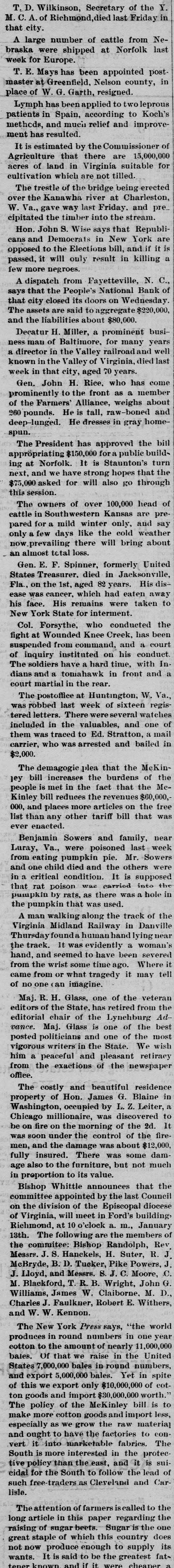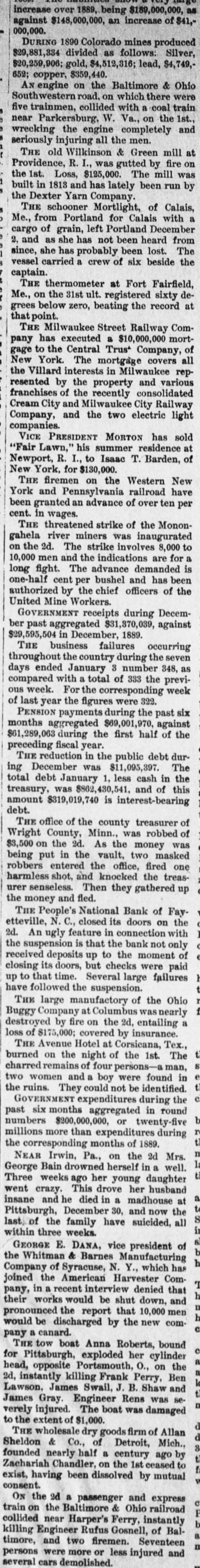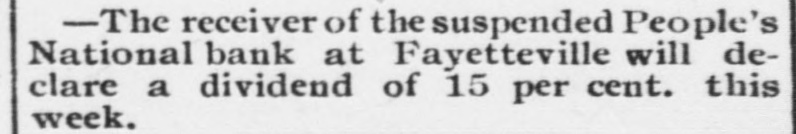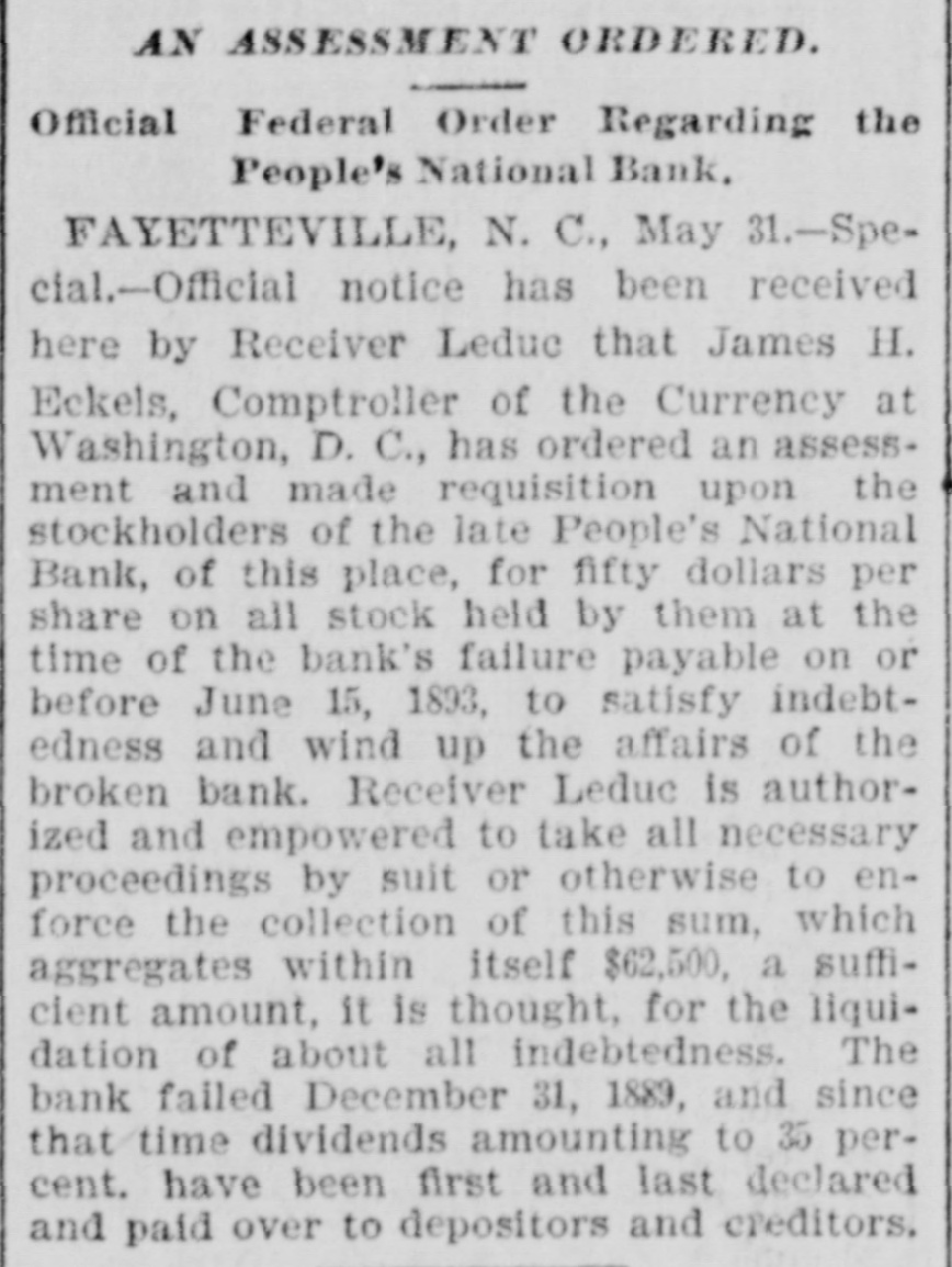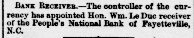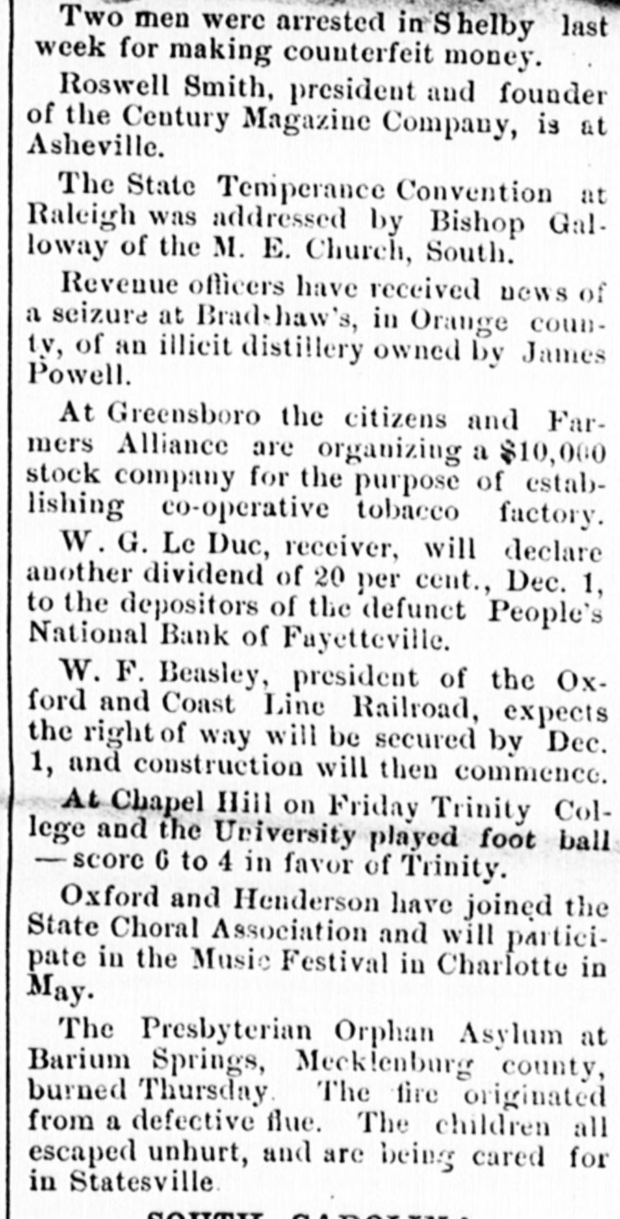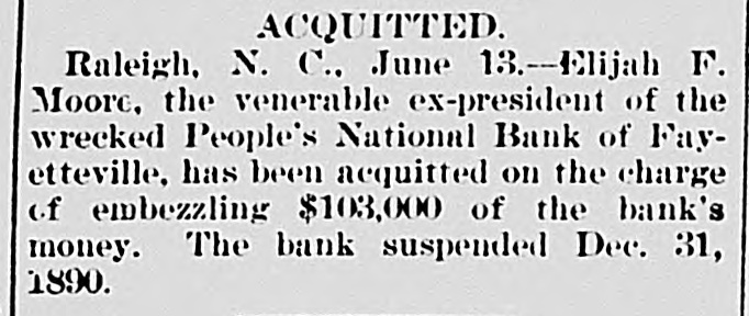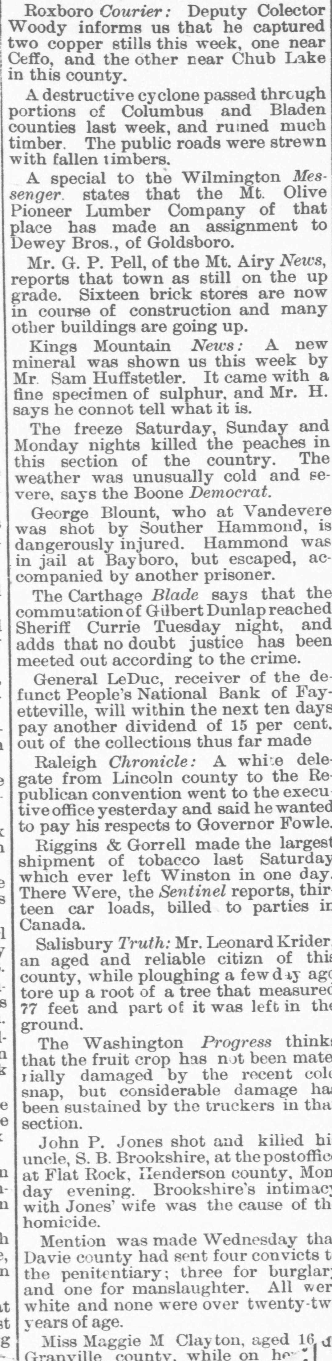 THE PEOPLE'S NATIONAL BANK CLOSE FOR $80,000. Grady Arrested for the Murder of HisWife-Seven Negro Children Roaster d Alive- War of Words Between Editors. North Carolina News. RALEIGH. N. C., Dec. [Special. A special from Fayetteville to-night announces that the People's National Ban OF that city closed its doors to-day on account of a heavy run made upon it. The run was caused by the failnee of the former president of the bank, E. F Moore, who recently resigned, and whose affairs are in bad condition. Th. liabilities are stated at $80,000. and the as sets $200,000. It is claime that the deposi tors will be paid dellar for dollar. and that the bank was closed so'ely 01 account of a run, which for a while looked paricky. The closing of the bank resulted in the failure of G.W. Ingram, J. L Taarm, and George Rosenthal, merchants of Fayetteville A NEW YEAR WEDDING To-morrow afternoon. in Edenton Street M E. chureb, in this city. Rev. J. D. Arnold of the faculty of Asheville Female College. of the most prominent ministers in the is estern North Carolina Conference. will be united in marriaze to Miss Nannie Clark of this city, sister of Associate Justice Walter Clark, of the North Carolina Supreme Court bench. GOVERNOR FOWLE IN HIS NEW HOME Governor Fowle to-day begun moving into the new Governor's Mansion, on Blount street, which is now completed. and which has been turned over to him by the State Public Buildi g Committee. WAR OF WORDS BETWEEN EDITORS. Editor Fairbrother of the Durbam Daily Globe, to-day replied to the attack made upon him vesterday by Josephus Daniels editor of the State Chronicle, in which Daniels referred to him as a coward and blackguard. Fairbrother's reply is very abusive of Daniels, and closes with in iting him t a personal settlement if he desires it, as be said, as his editorial intimates. KNIGHTS OF PYTHIAS BANQUET Last night the Knights of Pythias of this city held a grand banquet at which covers were laid for 125. After re'reshments were served speeches were made by his Honor A.A. Thompson. Captain E. R. Stamps, Grandsire C. M. Busbee, Joseph J. Bernard, Esq., Rev. George 1 underlid, George H. Snow, Esq.. and others. Mr. Hal W. Aver, late city editor of the Daily Chronicle of this city, left to-day for Washington, where be goes to take the position of private secretary to Colonel L. 1. Polk. president of the National Farmers' Alliance. DEPUTY COLLECTOR HAWKINS' SUCCESSOR E. A. White, collector of internal rever nue for the Eastern district of North Carolina, has appointed Benjamin Hawkins deputy collector of Vance, Franklin, and Warren counties, to succeed his father General Phil. B. Hawkins, who has resigned on account of illness. SEVEN CHILDREN ROASTED ALIVE A special from Bay boro, in Pamlico county, brings the blood-curdling news of the burning alive of seven negro children near that place Sunday night. A colored man named Scott Thompson, his wife and oldest child, who live five miles below Bayboro, went to church Sun. day night, leaving seven children, tive of them his own and two of them his grandchildren at home, their ages ranging from infancy to above tifteen years of age. Before the services were concluded it was discovered that their home was on fire, and the congregation made a rush for it. On nearing the scene of the conflagration the agonizing screams of the children could be plainly heard. but when the place was reached the building had fallen in, and every one of the inmates had perished in the flames. It is supposed that the tire aught in some way from the chimney, and spread rapidly, and all the children being sound asleep, did not awaken until the flames had cut off all egress. CHARGED WITH HIS WIFE'S MURDER Tilla J. Grady and his daughter-in-law were brought here to-day from Millbrook, in this county, and committed to jail, charged with the murder of Grady's wife by poisoning last week. Grady is about sixty years old and his daughterin-law is about twenty-two, and has a child only a few months old. Grady and wife have not lived happily together for many years. and she has Ire. quently had Grady arrested and before courts for squalt and battery upon ber. Since her son married he and his wife have been alivingwith Gradv The elder Mrs.Grady has imagined that her husband and her daughted-in-law saw too much of each other, and this has caused Tilla Grady's of wife to become intensely jealous her husband and her daughter-inlaw. On Monday of last week the four in family took breakfast together, and very soon atterwards Mrs. Tilla Grady was taken violently ill with symptoms that indicated menical poisoning and died in four hours. Her husband had left home as soon as be finished break. fast, and was not there when his wife died. The deceased declared from the time she was taken ill till she died that her husb and and daughter had poisoned her by putting something in the coffee which she drank. The coroner has for sev. eral days been holding an inquest, and the evidence was found to be sufficient for to hold the accused parties action by the grand jury. The body of Mrs. Grady has not been exbumed, but will be, and a post-mortem examination will be held at once. The family are well-known, and the affair creates great interest.
