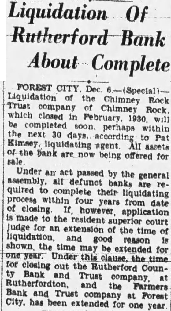 Liquidation Of Rutherford Bank About Complete FOREST CITY, Dec. 6-(Special)Liquidation Trust the Chimney Rock company of Chimney the be completed soon. perhaps within next 30 Kimsey. liquidating according agent. All to assets Pat of sale. the bank are now being offered for Under an act passed by the general assembly. all defunct banks are required to complete their liquidating process within four years from date is judge made for to the resident superior court an extension of the time of and good reason is shown the time may be extended for one year. Under this clause. the time for closing out the Rutherford CounBank and Trust company at Rutherfordton. and the Farmers Bank and Trust company at Forest City, has been extended for one year