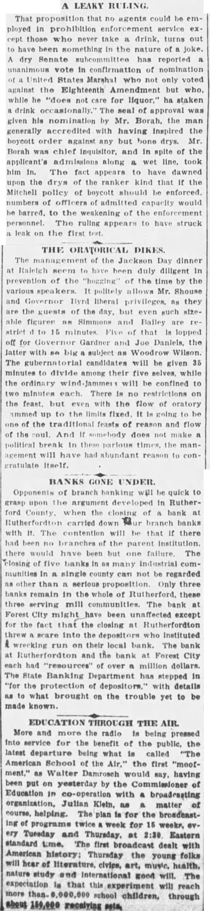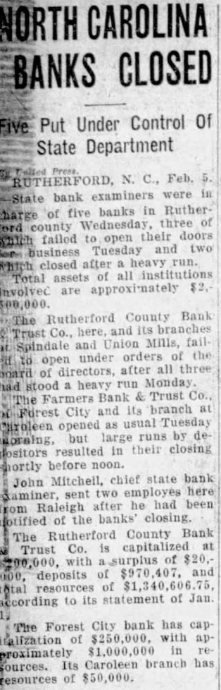 5 Rutherford Banks Close Their Doors (Continued from Page One) by the board of directors, was fixed to the doors declared the affairs of the banks had been put in hands the banking department for the protection of positors. on the Farmers' Bank and Forest lleved by bankers to outgrowth of the closing of the Rutherfordton followed by called meeting of directors the Forest City and the closing the as well its branch at The bank was placed in the hands the state banking department, notice sald. Feb Rutherford Bank and company with an industrial bank. the to this notice on the door "This closed by order of the directors for protec tion of the and action of the state banking depart The bank is capitalized its January total as surplus and deposits as Taylor president and Walker statement of Janu gave the deposits of Taylor president while W Walker cashier Arial cashier the Spindale branch. Resources the branches immediately Surplus and capital the est with of well lion dollars. Dr. president R. Hicks is cashier the Caroleen has re about $50.000 No this morning for the closing of the banks. was promised for morning. The closing of the and their branches only three banks in Rutherford They are at Bostic and Caroleen