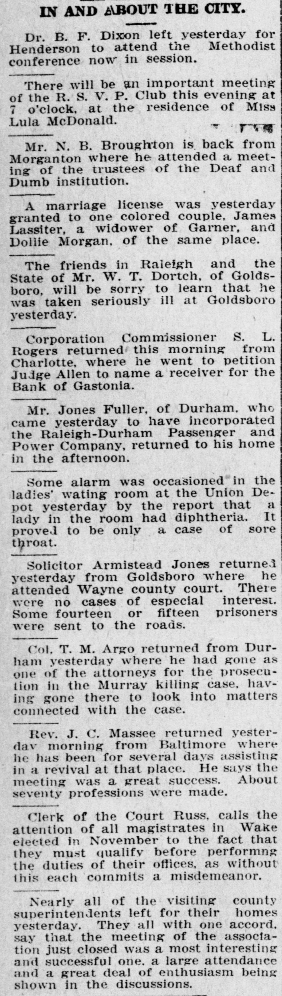 IN AND ABOUT THE CITY. Dr. B. F. Dixon left yesterday for Henderson to attend the Methodist conference now in session. There will be an important meeting of the R. S. V. P. Club this evening at 7 o'clock, at the residence of Miss Lula McDonald. Mr. N. B. Broughton is back from Morganton where he attended a meeting of the trustees of the Deaf and Dumb institution. A marriage license was yesterday granted to one colored couple, James Lassiter, a widower of Garner, and Dollie Morgan, of the same place. The friends in Raleigh and the State of Mr. W. T. Dortch, of Goldsboro, will be sorry to learn that he was taken seriously ill at Goldsboro yesterday. Corporation Commissioner S. L. Rogers returned this morning from Charlotte, where he went to petition Judge Allen to name a receiver for the Bank of Gastonia. Mr. Jones Fuller, of Durham, who came yesterday to have incorporated the Raleigh-Durham Passenger and Power Company, returned to his home in the afternoon. Some alarm was occasioned in the ladies' wating room at the Union Depot yesterday by the report that a lady in the room had diphtheria. It proved to be only a case of sore throat. Solicitor Armistead Jones returned yesterday from Goldsboro where he attended Wayne county court. There were no cases of especial interest. Some fourteen or fifteen prisoners were sent to the roads. Col. T. M. Argo returned from Durham yesterday where he had gone as one of the attorneys for the prosecution in the Murray killing case, having gone there to look into matters connected with the case. Rev. J. C. Massee returned yesterdav morning from Baltimore where he has been for several days assisting in a revival at that place. He says the meeting was a great success. About seventy professions were made. Clerk of the Court Russ, calls the attention of all magistrates in Wake elected in November to the fact that they must qualify before performng the duties of their offices, as without this each commits a misdemeanor. Nearly all of the visiting county superintendents left for their homes yesterday. They all with one accord. say that the meeting of the association just closed was a most interesting and successful one. a large attendance and a great deal of enthusiasm being shown in the discussions.