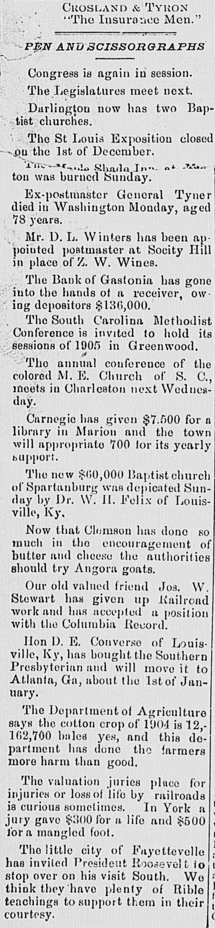 CROSLAND & TYRON "The Insurance Men." PEN AND SCISSORGRAPHS Congress is again in session. The Legislatures meet next. Darlington now has two Baptist churches. The St Louis Exposition closed on the 1st of December. Shade Inn at Man ton was burned Sunday. Ex-postmaster General Tyner died in Washington Monday, aged 78 years. Mr. D. L. Winters has been appointed postmaster at Socity Hill in place of Z. W. Wines. The Bank of Gastonia has gone into the hands of a receiver, OWing depositors $136,000. The South Carolina Methodist Conference is invited to hold its sessions of 1905 in Greenwood. The annual conference of the colored M. E. Church of S. C., meets in Charleston next Wednesday. Carnegie has given $7.500 for a library in Marion and the town will appropriate 700 for its yearly support. The new $60,000 Baptist church of Spartanburg was depicated Sunday by Dr. W. II. Felix of Louisville, Ky, Now that Clemson has done SO much in the encouragement of butter and cheese the authorities should try Angora goats. Our old valued friend Jos. W. Stewart has given up Railroad work and has accepted a position with the Columbia Record. Hon D. E. Converse of Louisville, Ky, has bought the Southern Presbyterian and will move it to Atlanta, Ga, about the 1st of January. The Department of Agriculture says the cotton crop of 1904 is 12,162,700 bales yes, and this department has done the farmers more harm than good. The valuation juries place for injuries or loss of life by railroads is curious sometimes. In York a jury gave $300 for a life and $500 for a mangled foot. The little city of Fayettevelle has invited President Roosevelt io stop over on his visit South. We think they have plenty of Rible teachings to support them in their courtesy.