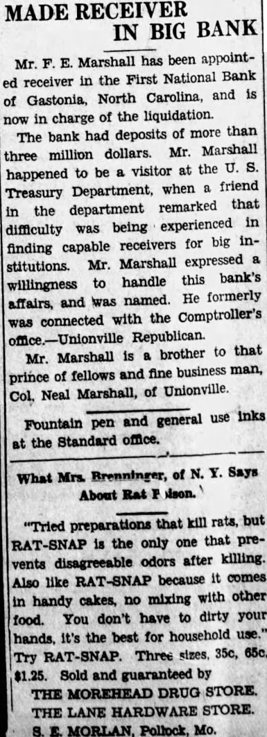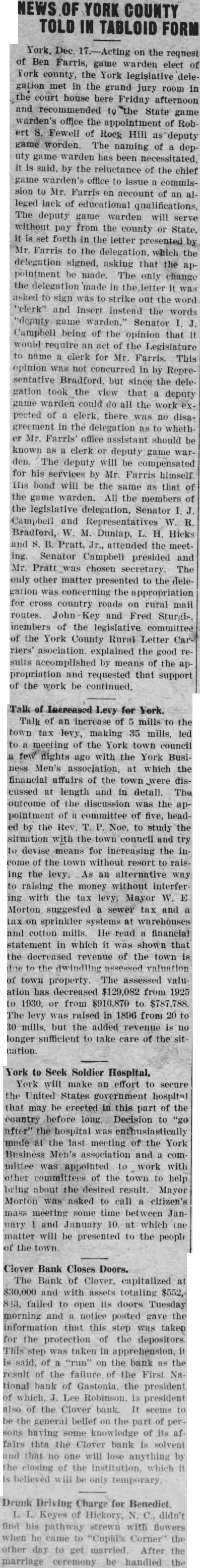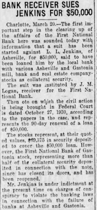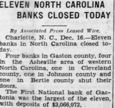 ELEVEN BANKS CLOSE RALEIGH, Dec. Eleven banks in North Carolina closed their doors today. Four banks in Gaston four Asheville area Western North Carolina. one Cleveland one county and one Bertie county shut their doors. The First National Bank of Gastonia was the largest the The Peoples Bank of Waco in Cleveland with capital of $111,shut its doors. The ClayBanking Company of Clayton. capitalized with resources did not The Bank Aulander Bertie with capital and also did not open. BANK OF CLOVER CLOSES Dec. The Bank Clover, York counclosed its doors today. Robinson, president of the First National Bank of Gastonia, failed to open this morning. also president of the Clover BUNCOMBE BANK CLOSES Dec. Swannanoa Bank and Trust Company oa, in Buncombe failed open doors this the board of directors taking this precautionary measure to protect the bank's assets. In its statement of tion, Swannanoa Bank and Trust Company reported deposliability of with tal stock and surplus and profits amounting $9,040. FRANKLIN BANK SHUT Bank Franklin closed morning leaving the town Franklin, Macon counwithout financial action taken the board of directors protect the deposiface threatened withdrawals today. The Citizens bank, during the financial with the Bank Franklin. BANK FAILS Dec. Bank Clyde, Clyde this morning by order of its board of directors, explained the tion taken "protect the positors. The bank heavy withdrawals yesterday. FLETCHER BANK CLOSES FLETCHER, Dec. Bank Fletcher, Henderson county, o'clock this in face heavy attributed the caused the closing other banks this closed deposit liability cording to the last statement. has surplus undivided profits $21,500. and Rhodes, cashier of the bank.
