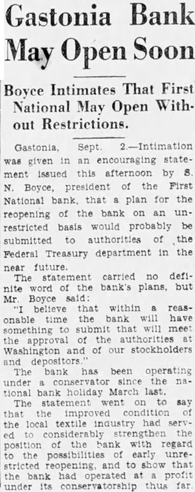 Gastonia Bank Soon May Open Boyce Intimates That First National May Open Without Restrictions. Sept 2.-Intimation was given an encouraging statement issued this afternoon by N. Boyce, president of the First National bank, that plan for the reopening of the bank on an restricted basis would probably be submitted to authorities of the Federal Treasury department in the near future. The statement carried no defiword the bank's plans, but Mr Boyce believe that within reasonable time the bank will have something to submit that will meet the approval of the authorities Washington and of our stockholders and depositors The bank has been operating under conservator since the national bank holiday March last. The statement went on to say that the improved the local textile industry had serv. ed the position the bank with regard the possibilities early unrestricted reopening and to that the bank had operated profit under its conservatorship thus far