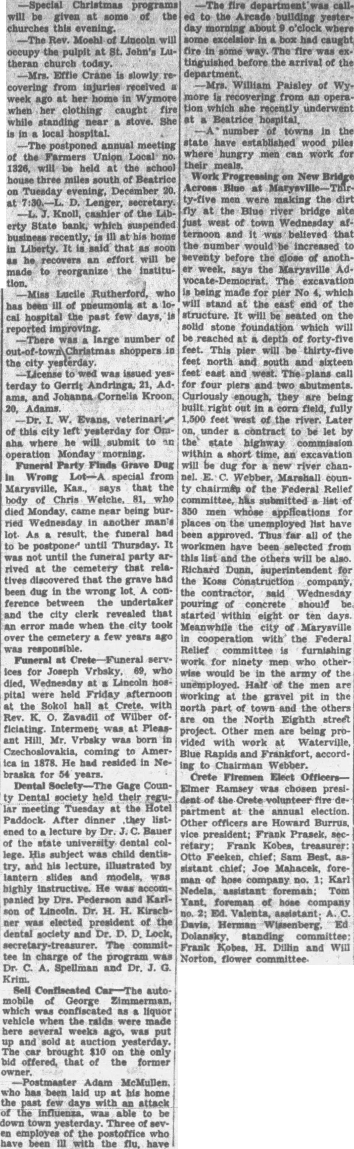 Miss Lucile Rutherford, who has been ill of pneumonia at a 10cal hospital the past few days, reported improving. -There was large number of shoppers in the city yesterday. -License to wed was issued yesterday to Gerrit Andringa, 21, Adams, and Johanna Cornelia Kroon, 20, Adams. -Dr. I. W. Evans, veterinari of this city left yesterday for Omaha where he will submit to an operation Monday morning. Funeral Party Finds Grave Dug In Wrong Lot-A special from Marysville, Kas., says that the body of Chris Weiche, 81, who died Monday, came near being burried Wednesday in another man's lot. As a result, the funeral had to be postponed until Thursday. It was not until the funeral party arrived at the cemetery that relatives discovered that the grave had been dug in the wrong lot. A conference between the undertaker and the city clerk revealed that an error made when the city took over the cemetery a few years ago was responsible. Funeral at servIces for Joseph Vrbsky, 69, who died, Wednesday at a Lincoln hospital were held Friday afternoon at the Sokol hall at Crete, with Rev. K. O. Zavadil of Wilber officiating. Interment was at Pleasant Hill, Mr. Vrbsky was born in Czechoslovakia, coming to America in 1878. He had resided in Nebraska for 54 years. Dental Society-The Gage County Dental society held their regular meeting Tuesday at the Hotel Paddock. After dinner they listened to lecture by Dr. Bauer of the state university dental college. His subject was child dentistry, and his lecture, illustrated by lantern slides and models, was highly instructive. He was accompanied by Drs. Pederson and Karlson of Lincoln. Dr. H. H. Kirschner was elected president of the dental society and Dr. D. D. Lock, secretary-treasurer. The committee in charge of the program was Dr. C. A. Spellman and Dr. J. G. Krim. Sell Confiscated Car-The automobile of George Zimmerman, which was confiscated as liquor vehicle when the raids were made here several weeks ago, was put up and sold at auction yesterday. The car brought $10 on the only bid offered, that of the former owner. -Postmaster Adam McMullen. who has been laid up at his home the past few days with an attack of the influenza, was able to be down town yesterday. Three of seven employes of the postoffice who have been ill with the flu, have