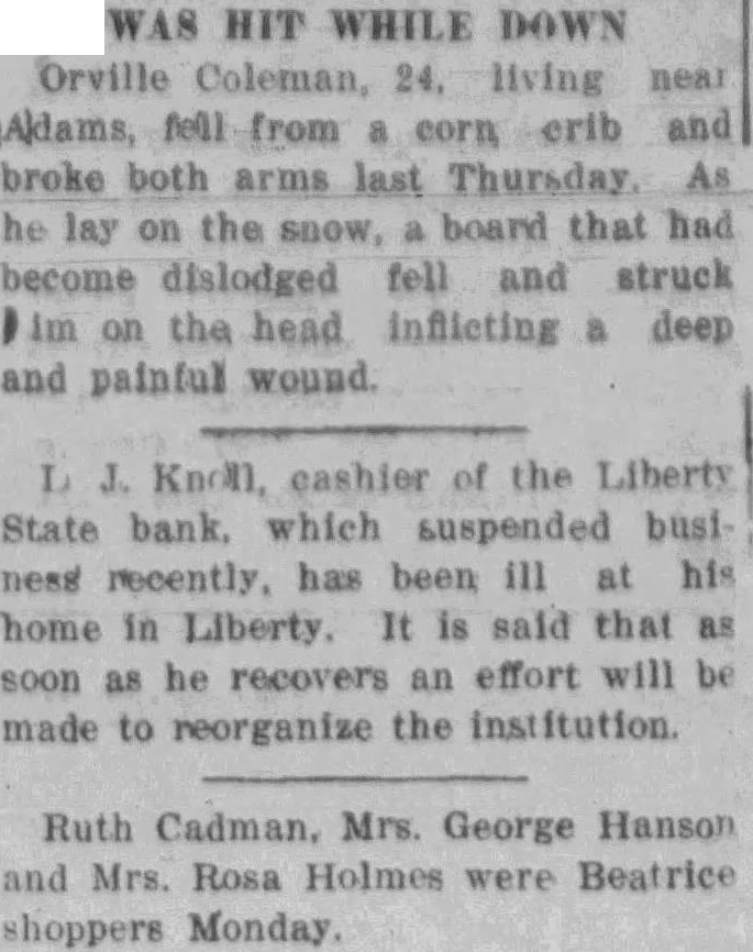 -Special Christmas programs will be given at some of the churches this evening. -The Rev. Moehl of Lincoln will occupy the pulpit at St. John's LAtheran church today. -Mrs. Effie Crane is slowly recovering from injuries received week ago at her home in Wymore when her clothing caught fire while standing near a stove. She is in a local hospital. postponed annual meeting of the Farmers Union Local no. their 1326, will be held at the school house three miles south of Beatrice on Tuesday evening, December 20. at D. Lenger, secretary. -L. Knoll, cashier of the Liberty State bank, which suspended business recently, is in at his home in Liberty. It is said that as soon as he recovers an effort will be made to reorganize the institution.