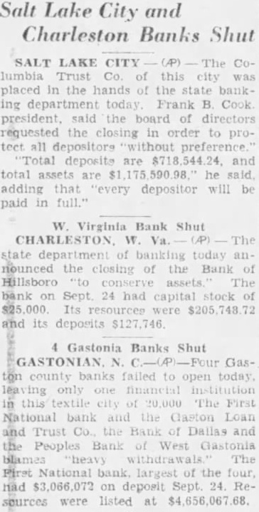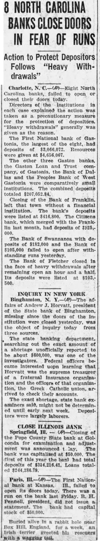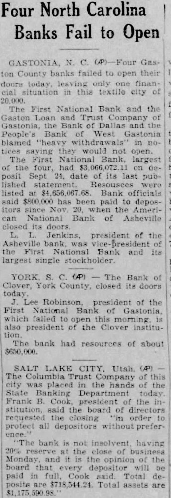 Special Charlotte Observer the announcement here last night of the closing of the First National Bank, the Gaston Loan and Trust company, the Peoples' Bank of Gastonia, and the Bank of Dallas, a mass meeting of some 300 or more leading including leading depositors of the Citizens National bank, the only remaining bank in the city of Gastonia, rose as unit to fortify the community from further financial disaster. That mass meeting proved today that had served its purpose well, and the citizenship of Gastonia went about its business in a calm and orderly fashion. There was no run on the Citizens National bank today. Although some small depositors called for their money, there was no crowd about the lobby of the bank, and by noon today the bank presented the appearance it does on any ordinary business day. G. Myers, its president, said this afternoon that deposits today had outnumbered withdrawals, while many new accounts were opened during the day. There was no evidence at all of any panicky feeling, and the general attitude this afternoon was one of quietude and confidence. The Citizens bank had prepared it: self for any emergency, and was prepared to pay any depositors who might wish to withdraw their money. special edition of The Gastonia Daily Gazette issued early this morning carried list of the names of some 300 or more leading citizens who expressed by their signa tures, in resolution presented to the mass meeting, absolute confidence in the Citizens National bank and their intention to continue deposits and refrain from withdrawals. The closing of the First National bank according to notice posted on the door of that institution this morning, by "reason of heavy withdrawals during the past several days this bank has suspended business by order of the board of directors for the protection of depositors. This action was taken after full consultation with the comptroller of the currency. These withdrawals. which had totaled some $800,000 since November 20, had been quiet and steady. They were occasioned by rumors following the failure of the Central Bank and Trust Co., and the American National bank in Asheville on that date. Officials of the First National the opinion that depositors will be paid 100 per cent The First National bank had deposits of resources of The Gaston Loan and Trust company had deposited $86,931 resources $135,363.16 capital $20,000. The Peoples Bank of West Gastonia had deposits of $64,042.91 The Bank of Dallas had deposits capital $20,000.