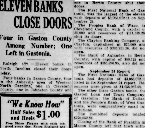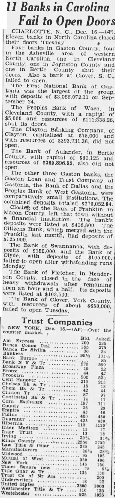 Fletcher (Henderson county)The Bank of Fletcher: deposits capital surplus and un divided profits $21,500 Clyde (Haywood Bank of Clyde: deposits $105,000 Waco (Cleveland county Peoples Bank of Waco: resources Clayton (Johnston county)-The Clayton Banking company: Aulander (Bertie Bank of Aulander: resources $385.In South Carolina the Bank and resources of $552,843 failed to open.