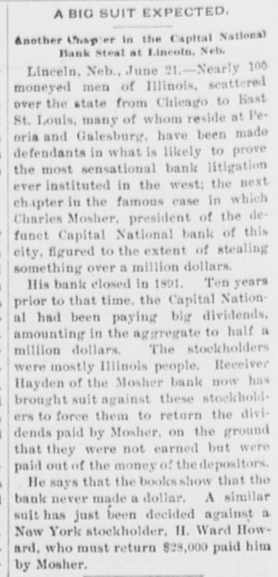 A BIG SUIT EXPECTED. Another Umpter in the Capital National Bank Steal at Lincoln, Neb. Linceln, Neb., June -Nearly 100 moneyed men of Illinois, scattered over the state from Chicago to East St. Louis, many of whom reside at Peoria and Galesburg, have been made defendants in what is likely to prove the most sensational bank litigation ever instituted in the west; the next chapter in the famous case in which Charles Mosher, president of the defunct Capital National bank of this city, figured to the extent of stealing something over a million dollars. His bank closed in 1891. Ten years prior to that time, the Capital National had been paying big dividends, amounting in the aggregate to half a million dollars. The stockholders were mostly Illinois people. Receiver Hayden of the Mosher bank now has brought suit against these stockholders to force them to return the dividends paid by Mosher, on the ground that they were not earned but were paid out of the money of the depositors. He says that the books show that the bank never made a dollar. A similar suit has just been decided against a New York stockholder, H. Ward Howard, who must return $28,000 paid him by Mosher.