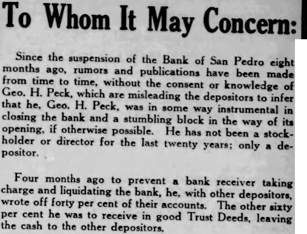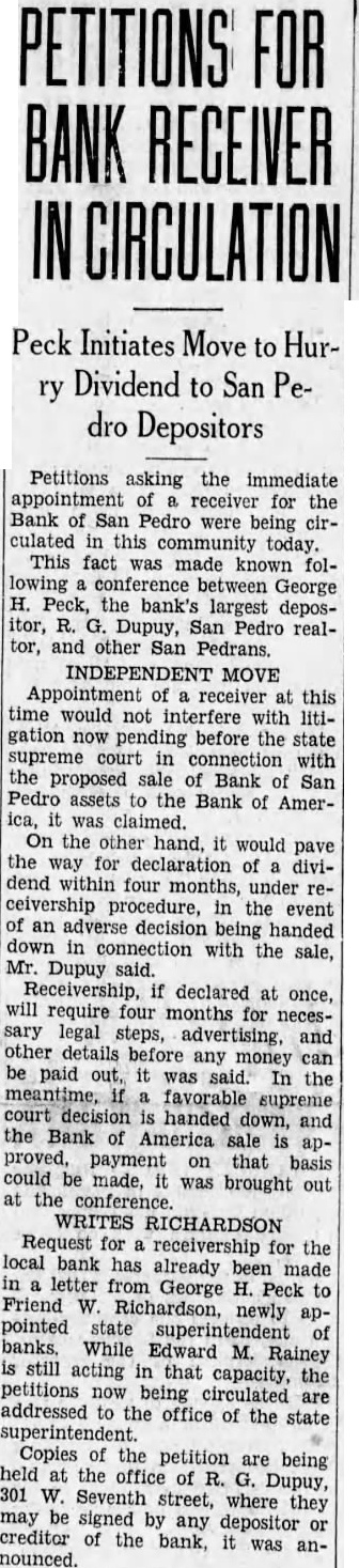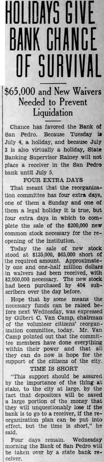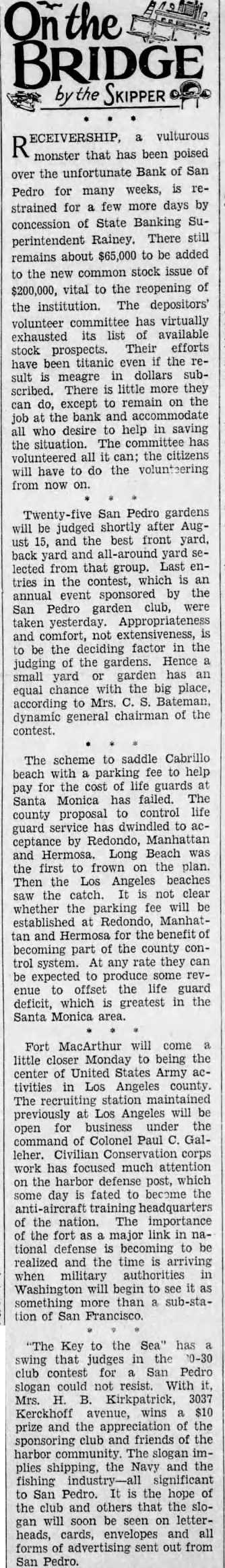 monster that has been poised unfortunate Bank of San the Pedro for many weeks, for few more days by strained of State Banking Suconcession There still perintendent Rainey. about $65,000 to be added remains stock issue of to the new common $200,000, vital to the reopening of the institution. The depositors' volunteer committee has virtually its list of available exhausted Their efforts stock prospects. have been titanic even if the result meagre in dollars subscribed. There is little more they except to remain on the can do, job the bank and all who desire to help in saving situation. The committee has the all the citizens volunteered can; will have to do the from now San Pedro gardens will be judged shortly after Augand the best front yard, ust back yard and all-around that group. Last lected from the contest, which an tries in sponsored by the annual event San Pedro garden club, were taken yesterday. Appropriateness and comfort, not extensiveness, to be the deciding factor in the judging of the gardens. Hence small yard garden has an chance with the big place, equal according to Mrs. dynamic general chairman of the contest. The scheme to saddle Cabrillo beach with parking fee to help pay for the cost of life guards at Santa Monica has failed. The county proposal to control life service has dwindled to acguard by Manhattan ceptance Hermosa. Long Beach was and to frown on the plan. the first Then the Los Angeles beaches catch. It not clear whether the parking fee will be established Redondo, Manhatand Hermosa for the benefit of becoming part of the county control system. any rate they can be expected to produce some revto offset the life guard enue deficit, which greatest in the Santa Monica Fort MacArthur will come little closer Monday to being the center United States Army activities Los Angeles county. The station maintained at Los Angeles will be for business under the open command of Colonel Paul Galleher. Civilian corps work focused much attention on the harbor defense post, which some day fated to become the anti-aircraft training headquarters the nation. The importance the fort major link in national defense becoming to be realized and the time arriving when military authorities in Washington will begin to see as something more than sub-station of San Francisco. "The Key to the Sea" has swing that judges in the 0-30 club contest for San Pedro slogan could resist. With it, Mrs. H. B. Kirkpatrick, 3037 Kerckhoff avenue, wins $10 prize and the appreciation of the sponsoring club and friends of the harbor community. The slogan plies shipping, the Navy and the fishing significant San Pedro. It is the hope of the and others that the slowill soon be seen on letterheads, cards, envelopes and all forms of advertising sent out from San Pedro.