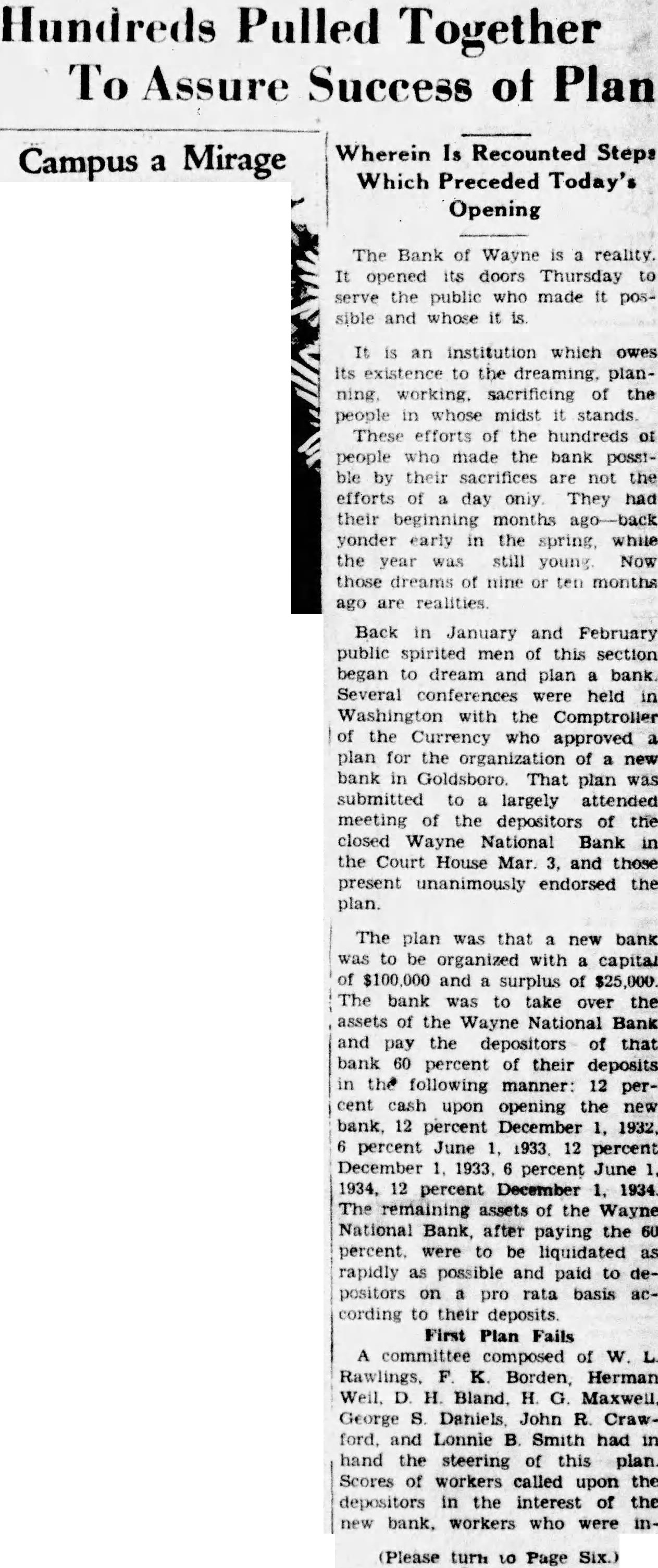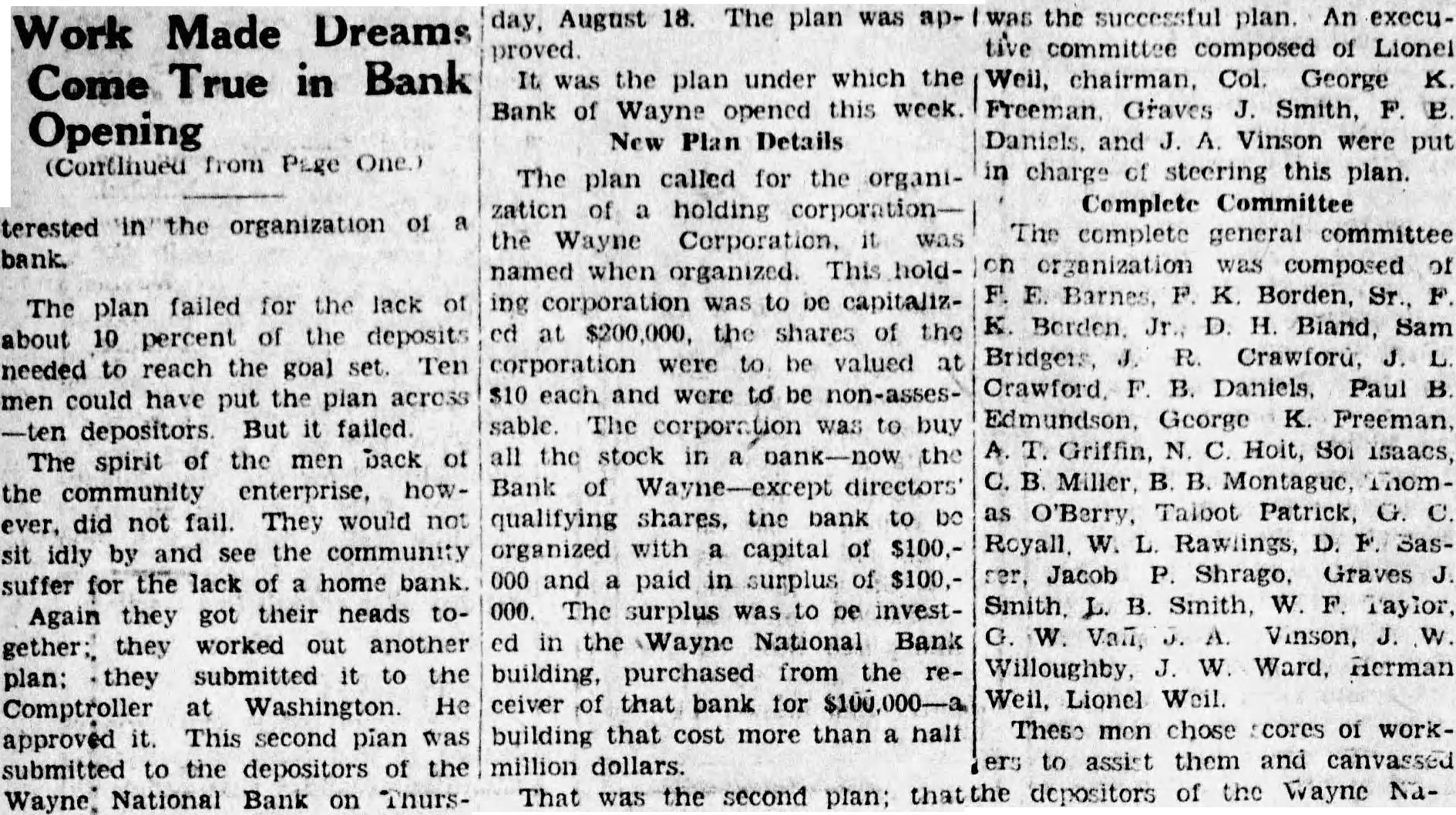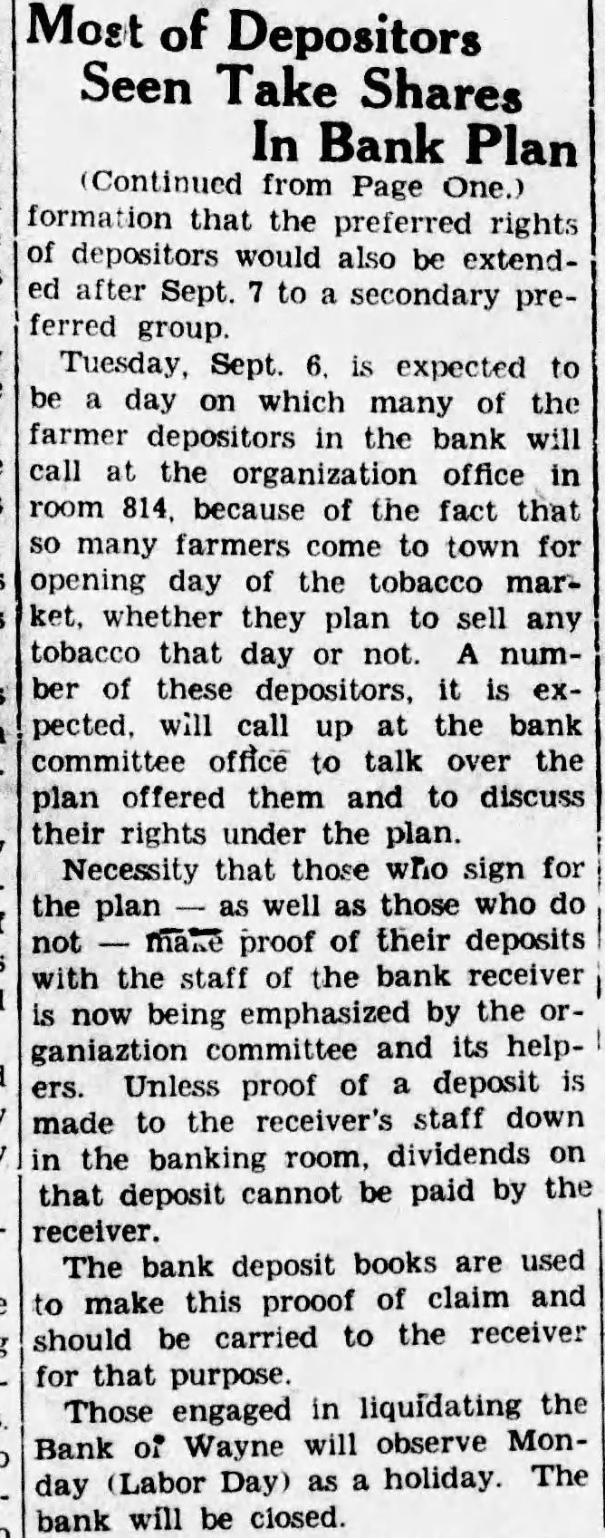 Most of Depositors Seen Take Shares In Bank (Continued from Page One.) formation that the rights of depositors would also be extendafter Sept. to secondary ferred group. Sept. expected to day on which many of the farmer depositors in the bank will call at the organization office in 814, because of the fact that many farmers come to town for opening day the tobacco marwhether they plan to sell any tobacco that day or not. numof these depositors, it pected. will call up at the bank committee office to talk over the plan offered them and to discuss their rights under the plan. Necessity that those who sign for the well as those who do not make proof of their deposits with the staff of the bank receiver now being emphasized by the ganiaztion committee and its Unless proof of deposit made to the receiver's staff down banking dividends on in the room, be paid by the that deposit cannot receiver. The bank deposit books are used this prooof of claim and to make should be carried to the receiver that purpose. liquidating the Those engaged in Bank of Wayne will observe Monholiday. The day (Labor bank will be closed.