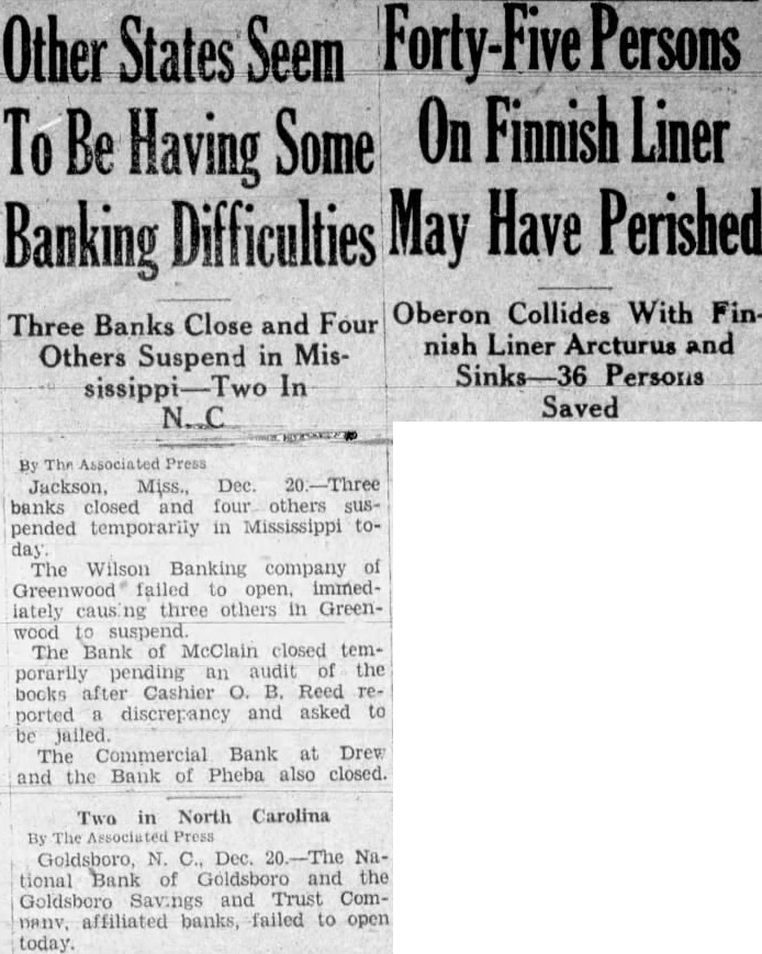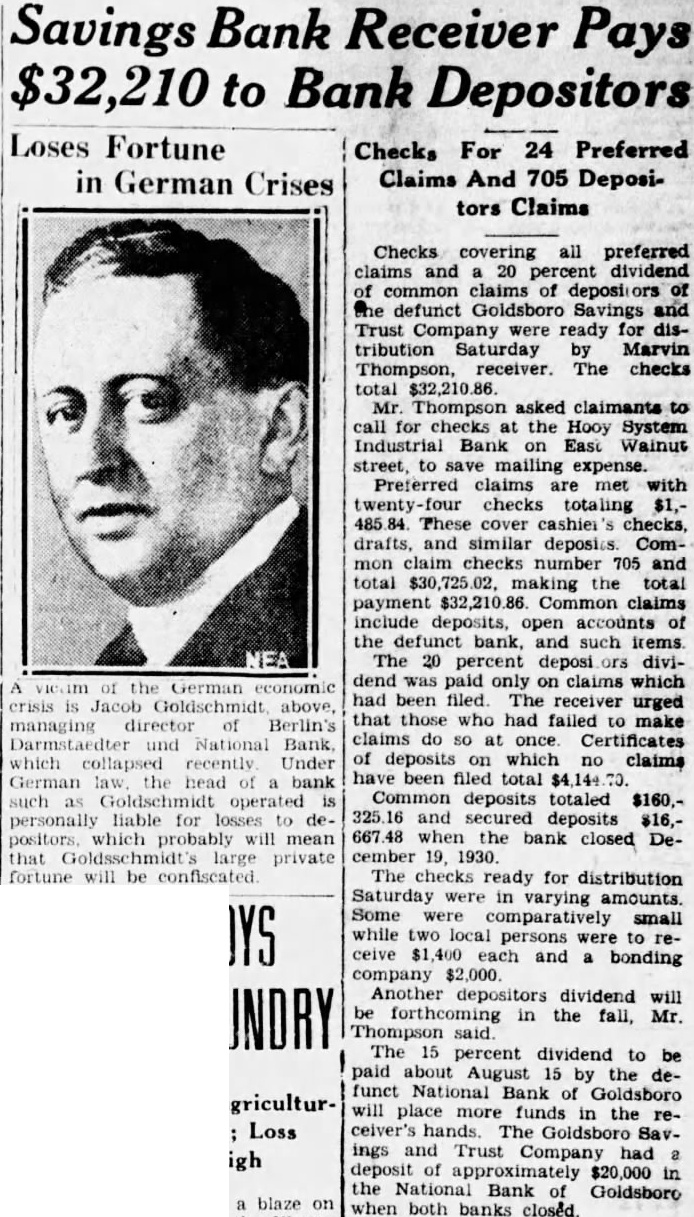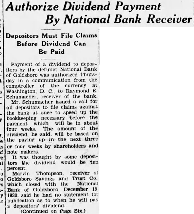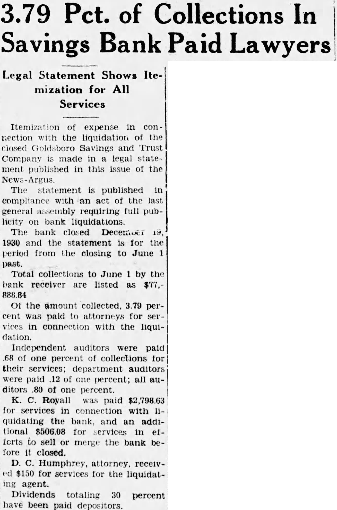 Atlantic Mortgage Co., ILA Federal Co., 1L Goldsboro Savings & Trust Co., Receiver Yetverton Estate, 7L Goldsboro Savings Trust Co., "Admr." Julius BrunEstate, 1L Goldsboro Savings & Trust Co., "Trustee," Edwards Estate. 3A Goldsboro Savings & Trust Co., "Admr. James Lovett Estate, 1L Isler Imp. Co., 2L John St.Holding Corp. 1L National Bank of Goldsboro 2L. Bal. New Messenger Co., IL Realty Sales Corp., SchulteUnited Inc., Lesse,