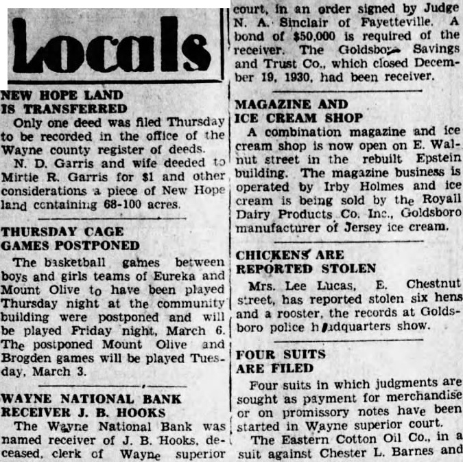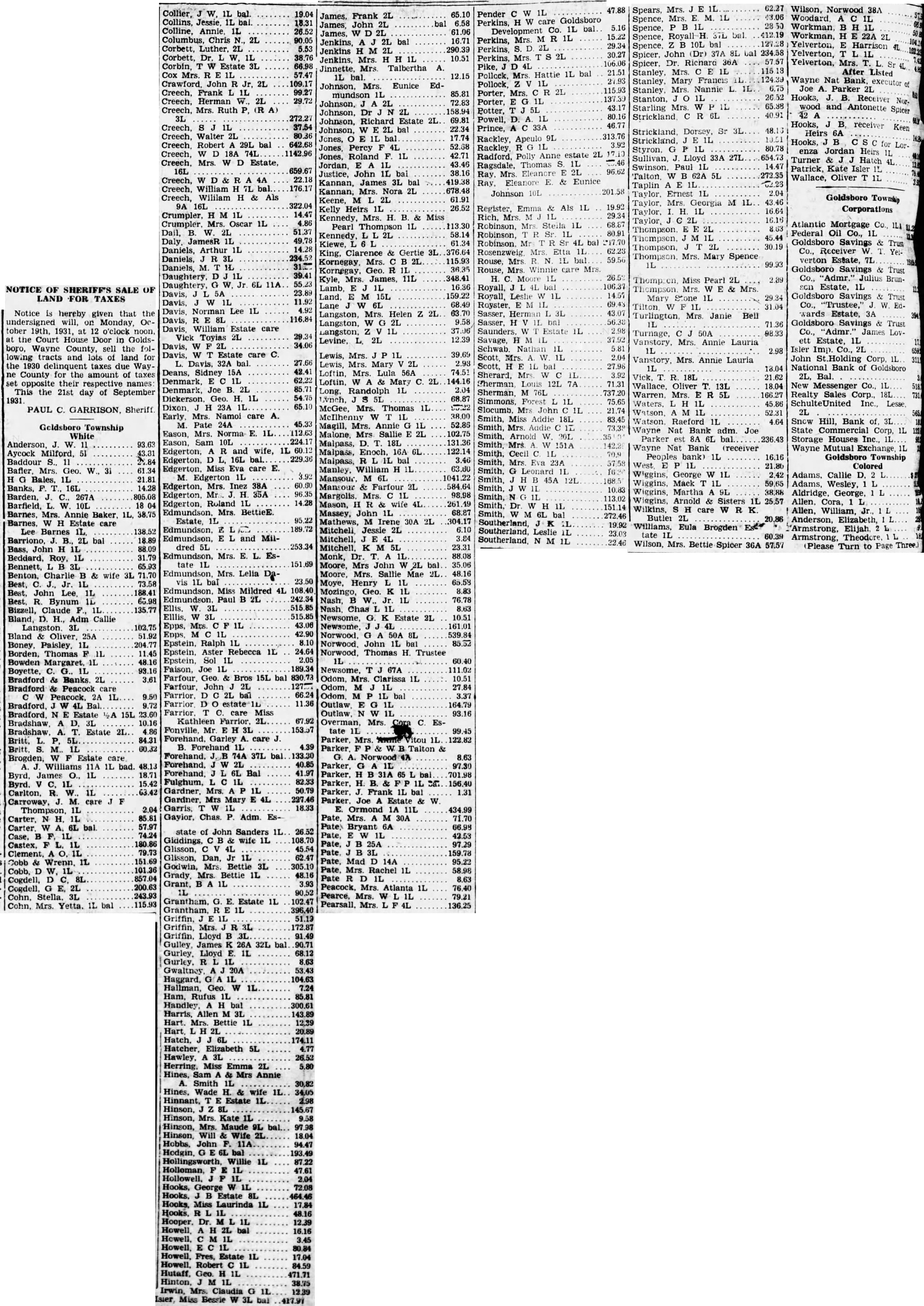 Spears, Mrs. Mrs. E. M. 43.06 Spence, 1L Spence, Royall bal. 412.19 Spence, B 10L bal 127.28 Spence, John (Dr) 37A 8L 234.58 Spicer, 57.57 Spicer, Dr. Richard 36A Stanley, Mrs. IL Stanley, Mary Francis 1L 124.39 Stanley, Mrs. Nannie L. IL. 6.75 26.52 Stanton, Mrs. W IL 65.38 Starling Strickland, C R 6L 40.91 Strickland, Dorsey, Sr 3L. 48.13 10.51 Styron. G 1L 80.78 Sullivan, Lloyd 33A 27L 654.73 Swinson. Paul 1L 14.47 Talton. W 62A 5L 272.35 Taplin Ernest 2.04 Taylor, Mrs. Georgia M 43.46 H. 1L 16.64 Taylor, 2L 16.16 Thompson. 2L 8.63 45.44 Thompson, 2L 30.19 Thompson, Mrs. Mary Spence 1L 99.93 Thempso Miss Pearl 2L Thompson Mrs. W E & Mrs. Mary Stone 1L 29.34 Tilton W 1L 31.04 Turlington, Mrs. Janie Bell 71.36 Turnage, 50A 98.33 Vanstory. Mrs. Annie Lauria 1L 2.98 Vanstory, Mrs. Annie Lauria 18.04 T. R. 18L 21.62 Wallace. Oliver T. 13L 18.04 Warren, Mrs. R 5L 166.27 Waters. 1L 45.86 52.31 Watson Raeford 1L 4.64 Wayne Nat Bank adm. Joe Parker est 8A 6L bal. 236.43 Wayne Nat Bank (receiver Peoples bank) 1L 16.16 1L 21.86 Wiggins, George W 1L 2.42 Wiggins, Mack 1L 59.65 Wiggins, Martha A 9L 38.88 Wiggins, Arnold & Sisters 1L 25.57 Wilkins, S H care W R K. Butler 2L 20.86 Williams. Eula Brogden tate 60.39 Mrs. Bettie Spicer 36A 57.57