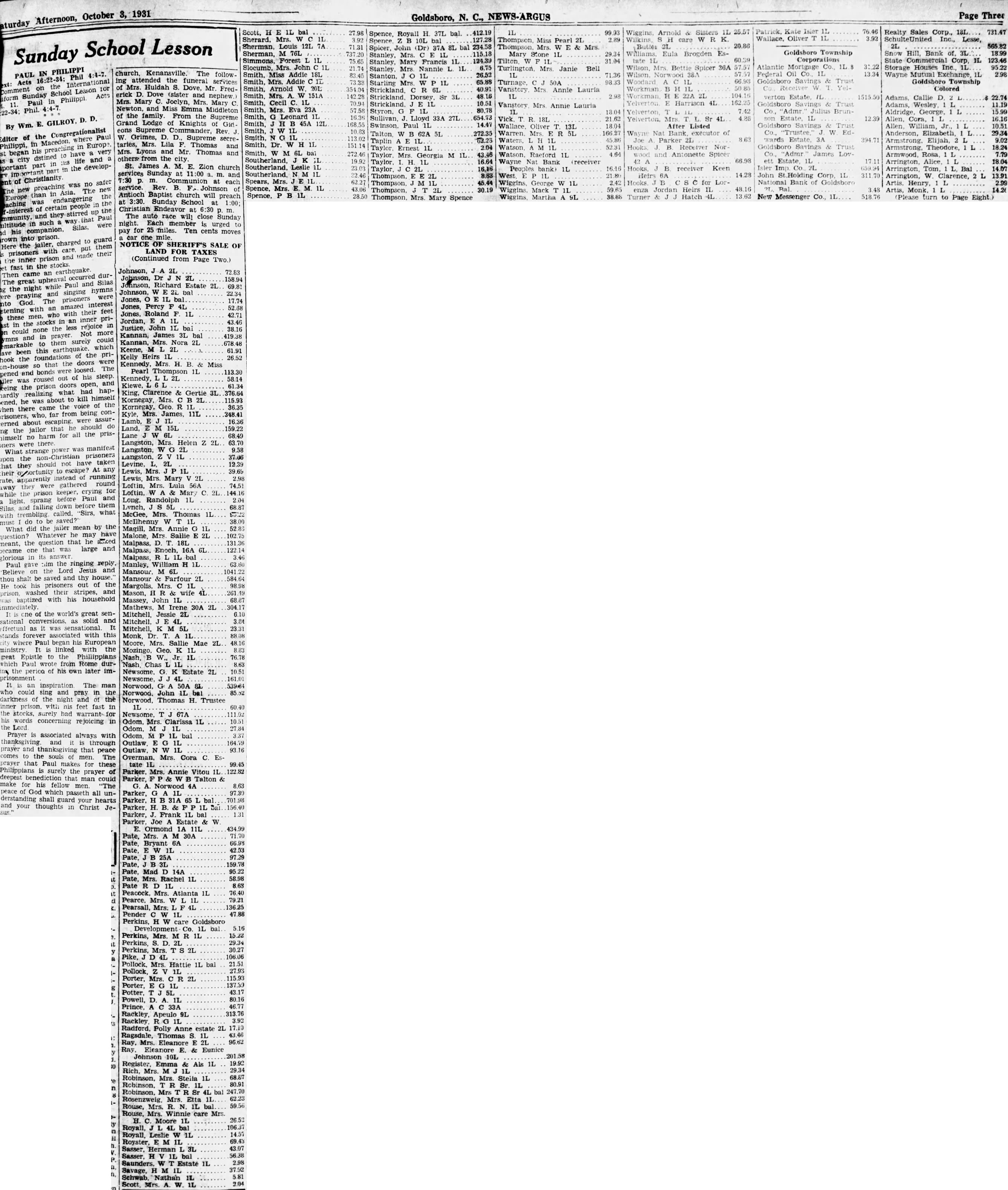 Collier. 1L bal. 19.04 Collins, Jessie, 1L bal. 18.31 Colline, Annie, IL 26.52 Columbus, Chris N., 2L 90.05 Corbett, Luther, 2L 5.53 Corbett, Dr. W, 1L 38.76 Corbin, W Estate 3L 66.98 Cox Mrs. R E 1L 57.47 Crawford, John R Jr, 2L 109.17 Creech, Frank L 99.27 Creech, Herman W., 2L 29.72 Creech, Mrs. Ruth P, (R A) 3L 272.27 Creech, IL 37.54 Creech, Walter 2L 80.36 Creech, Robert 29L bal 642.68 Creech, W 18A 1142.96 Creech, Mrs. W D Estate, 16L 659.67 Creech, W D & R A 4A 22.18 Creech, William 176.17 Creech, Wililam H & Als 9A 16L 322.04 Crumpler, H M 1L 14.47 Crumpler. Mrs. Oscar IL 4.86 Dail, W. 2L 51.37 Daly. JamesR 49.78 Daniels, Arthur 1L 14.28 Daniels. R 3L 234.52 Daughtery, 1L 39.41 Daughtery, G W. Jr 6L 11A. 55.23 Davis, 5A 23.89 Davis, 11.92 Davis, Norman Lee IL 4.92 Davis, 8L 116.84 Davis, William Estate care Vick Toyias 2L 29.34 Davis, W 34.06 Davis, Estate care C. Davis. 32A bal. 27.66 Deans, Sidney 15A 42.41 Denmark, 1L 62.22 Denmark, Joe B. 2L 85.71 Dickerson. Geo. H. 1L 54.75 Dixon. H 23A 1L 65.10 Early, Mrs. Namoi care A. M. Pate 24A 45.33 Eason, Mrs. Norma E. IL. 112.63 Sam 10L 224.17 Edgerton, R and wife, IL Edgerton, 16L bal. 229.36 Edgerton, Miss Eva care E. M. Edgerton 1L 3.92 Edgerton, Mrs. Inez 38A 60.60 Edgerton, Mr. 35A 96.35 Edgerton, Roland 1L 14.28 Edmundson. Mrs. BettieE. 95.22 189.72 Edmundson, L and Mildred 5L 253.34 Edmundson, Mrs. E. L. Estate 151.69 Edmundson, Mrs. Lelia Davis 1L bal 23.50 Edmundson. Miss Mildred 4L Edmundson. Paul B 2L 242.34 Ellis. 3L 515.85 Elllis, W 3L 515.85 Epps, Mrs. IL 43.06 Epps. 42.90 Epstein, Ralph 1L 8.10 Epstein, Aster Rebecca IL 24.64 Epstein, Sol IL 2.05 Faison. Joe 189.34 Farfour. Geo. Bros 15L bal John 2L Farrior. 2L bal 66.24 Farrior estate 11.36 Farrior care Miss Kathleen Farrior. 2L. 67.92 Fonville, Mr. E H 3L 153.57 Forehand. Garley care J. B. Forehand 1L 4.39 Forehand, 74A 37L bal 133.30 2L 40.85 6L Bal 41.97 Fulghum, C IL 82.33 Mrs. 50.79 Gardner. Mrs Mary E 4L 227.46 Garris, W 18.33 Gaylor, Chas. P. Adm. Esstate of John Sanders 1L 26.52 wife 1L 108.70 Glisson, 4L 45.54 Glisson, Dan, Jr 62.47 Godwin, Mrs. Bettie 3L 305.10 Grady, Mrs. Bettie IL 48.16 Grant, 1L 3.93 90.52 Grantham. G. E. Estate IL 102.47 1L 396.40 51.19 Griffin, Mrs. 3L 172.87 Griffin, Lloyd B 91.49 Gulley, James 26A 32L bal. 90.71 Gurley, Lloyd E. IL 68.12 8.63 Gwaltney, 20A 53.43 Haggard, IL 104.63 Hallman, Geo. W 1L 7.24 Ham, Rufus IL 85.81 Handley, bal 300.61 Harris, Allen M 3L 143.89 Hart. Mrs. Bettie 1L 12.39 Hart. 2L 20.89 Hatch. 6L 174.11 Hatcher, Elizabeth 5L 4.77 Hawley, 3L 26.52 Herring, Miss Emma 2L 5.80 Hines, Sam & Mrs Annie Smith IL 30,82 Hines, Wade H. & wife IL. 34.05 Hinnant, Estate IL 2.98 Hinson, 8L 145.67 Hinson, Mrs. Kate IL 9.58 Hinson, Mrs. Maude 9L Hinson, Will & Wife 18.04 Hobbs, John 11A 94.47 Hodgin, 6L bal 193.49 Hollingsworth, Willie IL 87.22 IL 47.61 IL 2.04 Hooks. George W IL 72.08 Hooks, Estate 8L 464.46 Hooks. Miss Laurinda IL 17.84 Hooks, IL 48.16 Hooper. Dr. M IL 12.39 Howell. A H 2L bal 16.16 M 3.45 E 80.84 Howell, Fres, Estate IL 17.04 Howell, Robert C IL 84.59 Hutaff. Geo. H IL 471.71 M 38.75 Irwin, Mrs. G 12.39 Miss Bessie W 3L bal