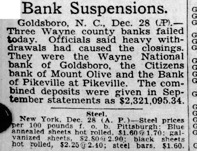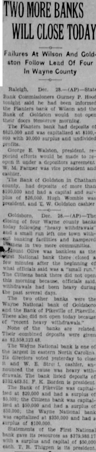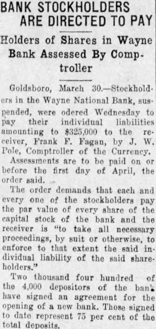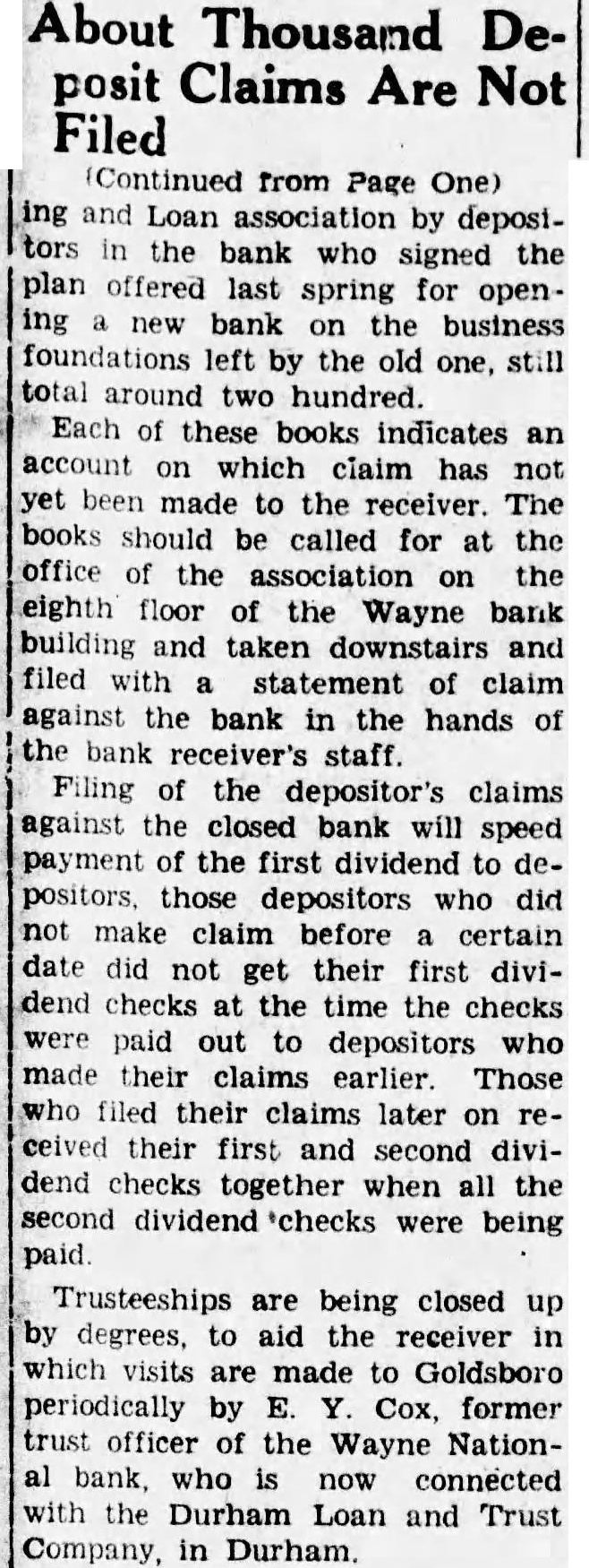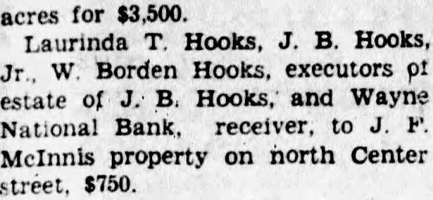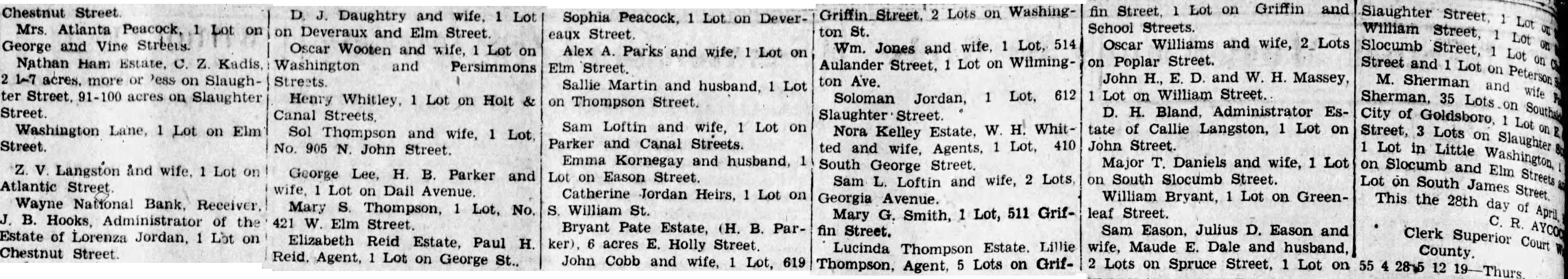 Sam Loftin and wife, 1 Lot on Parker and Canal Streets Emma Kornegay and husband, 1 Lot on Eason Street. Catherine Jordan Heirs, 1 Lot on S. William St. Bryant Pate Estate, (H. B. Parker). 6 acres E. Holly Street. John Cobb and wife, 1 Lot, 619