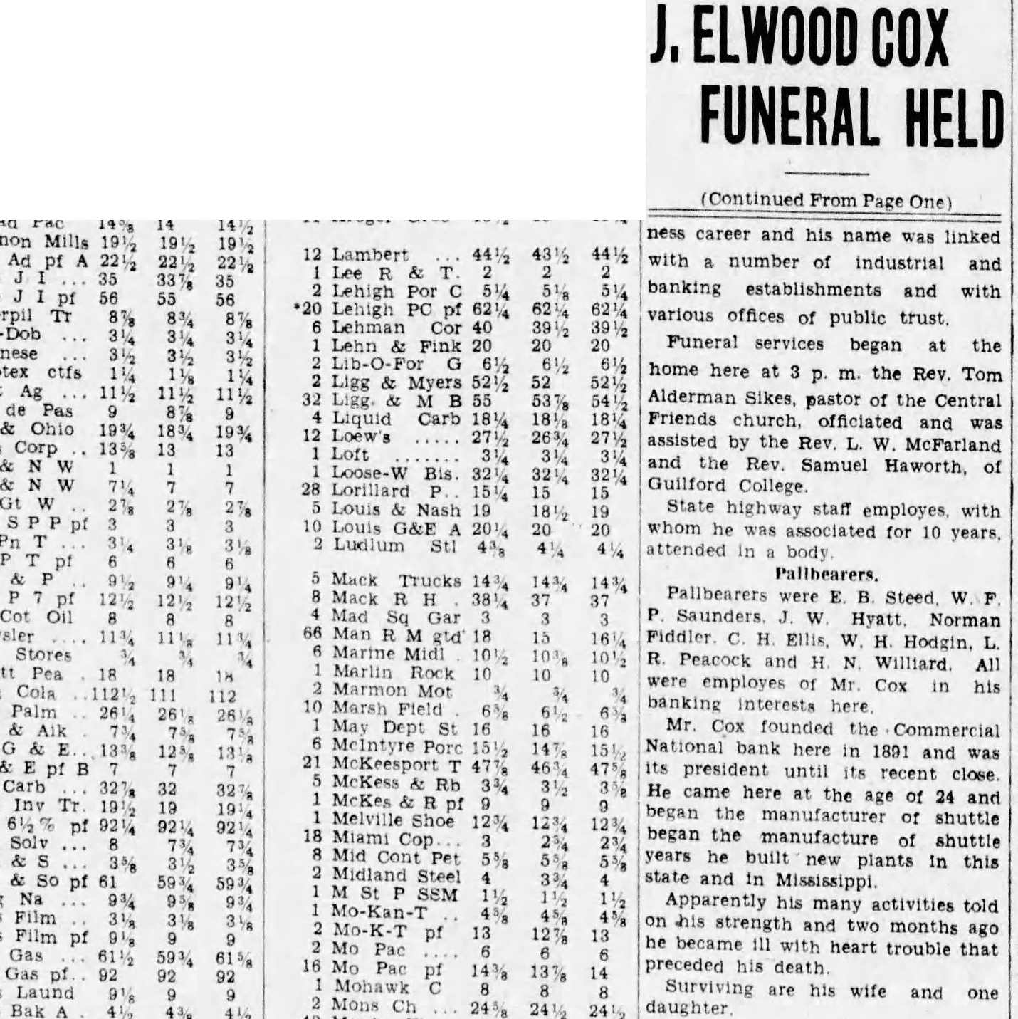 ELWOOD COX FUNERAL HELD (Continued From Page One) ness career and his name was linked Mills Lambert Ad pf number of industrial and Lehigh Por banking establishments and with Lehigh various offices of public trust. Lehman Funeral services began at the home here at m. the Rev. Tom Myers Alderman Sikes, pastor of the Central Liquid Carb Friends church, officiated was Ohio assisted by the Rev. W. McFarland Corp the Rev. Samuel Haworth, of Guilford College Lorillard Nash State highway staff employes, with Louis whom he was associated for 10 years, attended body Pallbearers. Mack Trucks Pallbearers were B. Steed Cot Oil Gar Saunders Hyatt Norman Fiddler H. Ellis. W. Hodgin, Marine R. Peacock and H. All Pea Marlin were employes of Mr. Cox in his Cola Marmon banking interests here Marsh Palm Mr. Cox founded the Commercial National bank here in 1891 and was pf its president until its recent close Carb He came here at the age of 24 and McKes began the manufacturer of shuttle Melville pf Miami began the manufacture of shuttle years he built plants In this Midland state and in Mississippi. Apparently his many activities told Mo-Kan-T on his strength and two months ago Mo-K-T pf he became ill with heart trouble that Gas preceded death Gas Mohawk Surviving are his wife and one Laund Mons Bak daughter