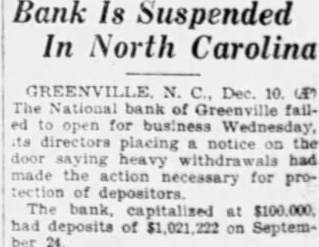 Bank Is Suspended In North Carolina The of Greenville failed open for Wednesday, ta directors placing notice on the saying withdrawals had made the action necessary for protection of The bank, capitalized at $100,000 had deposits of $1,021,222 on September 24.