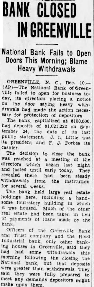 New York Stock Exchange TONE AGAIN WEAK ON BUFFALO BOARD and cood and and and common and SHEEP 5.000 fully fat held common good 3 MORE NORTH CAROLINA BANKS CLOSE THEIR DOORS RALEIGH 10 (U.N. North Carolina banks were in the hands the state banking de. partment today. involving some $700.000 in The bank D. Rockingham with deposits $400,000. capital $100,000 surplus $802,689.73 was closed by of frozen assets and fficials Citizens Bank of Farmville de. posits $215,306 capital surplus, closed The Bank Hobgood, deposits $49.261, capital $10,000. was closed by frozen assets authorities announced. GREENVILLE BANK CLOSES GREENVILLE Dec. 10 The National Bank of Greenville failed to open for business today, its directors notice on the saying heavy had necessary for protection of depositors 5c higher. Trading Continues at Fairly Brisk Pace as Prices Decline Through List. Prices again were weak on the Buffalo exchange Trading continued fairly brisk pace. Buffalo, Niagara Eastern preferred, Commercial Share Iroquois Share and Niagara steady and unchanged from their previous closes Liberty Share sold off to new low for the year at 20. T Securities was fractionally higher. Bank somewhat irreguFirst National declined half above its and Trust steady and unchanged Union Natural Gas registered the largest This stock sold down eight new low for the year at was the first in this issue in several months. Bonds also moved lower. Niagara Share entered low territory for the year Western New York point to Liberty Share and Danahy Faxon were both ex-dividend 25c today The following quotations represent only those prices shares stocks listed here and 50 shares for which the trading ten shares. STOCKS Sales High Low 10% 10% 675 BANK AND INSURANCE STOCKS First 839 Midland INVESTMENT TRUSTS AND SHARE 14 Share Liberty Share xd M 13% 3169 176 do warrants UNLISTED SECURITIES 160 Union 16% BONDS 106% 102 do 101% 1000 WNYW 93 BID AND ASKED The quotations show the bid Calves Sheep but Stock which no round sales made grades of STOCKS and and Dividend Bid Sales Abstract here was the Gen pfd bids Buffalo Corp can and Deco $1 rams do pfd $3.50 Ford Inc Choice 1100 Niagara Arbitrage Fair good Plain Ice Cream $2.40 Long and yearlings 86 150 Best 115 Medium good Good Title Mortgage $1.20 Common Ward & Dickinson Water Good 5.00@ BANK AND INSURANCE STOCKS butchering Kenmore East Side National good State Kenmore 95 bulls INVESTMENT TRUSTS AND SHARE Milkers and springers Hog prices under with 13 UNLISTED SECURITIES Good Int 20 weight 240 Air Trust Natural Buffalo deb 106 Buffalo 95 Buffalo The was Fed Sheep Flexlume were Power Spring lambs yearlings Share The demand was Kellogg 98 Monday WNYW 30 1st also ranging from $10 OVER THE COUNTER STOCKS EX-DIVIDEND TODAY Bank Note 50c: com. extra American Safety Razor $1.25. American Tobacco pf. Armour Co. of ni. Armour & of Del. pf. Bendix 25c. Commercial Solvents 25c Cons. Cuba pf. $1.50. Crown Cork 25c General Railway Signal Liggett Myers pf. $1.75 Monsanto Chemical 311/4c; stock PREFERRED DIVIDEND DEFERRED NEW YORK 10 Directors of H. Mallinson & Co., Inc., silk manufacturers announced that declaration of the regular dividend on the cumulative preferred stock payable on Jan. had been deferred, owing to general business conditions DRY GOODS NEW YORK goods markets with cloths quoted for 64x60s and at 614 for 68x72s. Raw silks were quiet and Pure Oil 514% pf. $1.25; 6% $1.50: pf Reo Motor Car 20c Rhine Westphalia Elec. $2.14 United Aircraft pf. $1.75 & pf 75; pf. $1.75: pf. and pf. accum Yale & Towne Mfg. 50c. Low Stock Div rate Open High Low 2:50 Stock & Div Open High Low Stock rate Open High Low 2:50 Div rate Open High 40% 401/2 40% Midl'd Steel 211/2 United Cigar Cudahy Curtiss Wright Mo United Abitibi 10 10 Uni Wright Adams .60 40% 40% 39% 39% Mo Pacific 26 United Cutler Ha Adams Millis Mo Un 26% 27 26 Adv Rumely Mohawk 11% 28 271/4 Davison Chem 15% Adv Rumely Montg 20 18% For 9% Deere 22 Ahumada Lead 24 23 137 136 Mother Air Reduct 100 97% Motor 29 29 28 28 Airway 101/4 10 10 Dela 170 Ind 611/4 62 59 59 Detr 170 170 170 Ajax Rubber 30 30 30 Dev *1.20 Muns'gwear Alaska Juneau 6% Murray Bod 12% 12% 12% Real 30% 29 29 Mines Alleghany Cor Myer Bros 38% 38% Rubber 14% 15 14 14 Allied 200 Dom Stor 63 61% 61% Rub 34% 34% Drug Inc 88 83% 83% Nash Motor 27 25% 25% 20% 201/4 DuP Acme Am Nat 1441/4 East Kodak 156 157 151% 152 Am 73% United Am Note Eaton Univ 28 2.40 33% Eitington Am Universal Pipe 2% 2% 2% Am Nat Dairy 2.60 Util 23% 24 Am Can Electric Boat Am Can Elec Nat 23 Am 35 35 Nat 531/4 Am Chain Erie 38% 38% Vulcan 41% Am 10% Au Am Evan Surety 48% Am 23% Am Fash Park 96 12% Am Fair .60 Ward Bak Fed 2534 Am 2.60 161/2 Nickel 75% Firestone Am *2 First 2.50 N Y Inves 1.20 5% 5% Am Fisk Rubber Warn Quinlan New Am 15 Web Eisenlohr 18 Am Wheel 50 Wesson Oil2 Foster West Maryland. 61/4 West Fourth Inves 196% 194% 130% Am 181/2 West 130% Film Am Republics West Freeport 31% Am Am Am Westing Gabriel Am Weston Gardner North'n 507/8 Am Ref Westvaco 65% Am Snuff White Am Ohio 181/8 Am Stores*2 Oliver Farm Am Sug Wilson Am Collins Woolw 60 Am Elev 2.50 73 Worth Pump Gen .60 Am Otis Steel 68 67% 67% Tobacco 5 Wrigley Jr4 Am Tobac Owen 30 Am 125% Yale Town 2 31 Am Pacific 47 Yellow 56% Young 8% 751/4 75 75 Young pf 42 Am 42 27/8 2½ Zenith Radio Am Tilford 34 34 40 Exchan LIVESTOCK Pathe Arch Da Mid 1.20 Motor EAST BUFFALO, Dec Del pf Cattle Armour Ill A 36 Armour Apparel 2.50 205 205 202 205 Marq Grand 23 23 Ref 16 Oil Pierce Mot Grigsby Gru Prairie Hahn Bros Hartman Helme G Hershey Hem 40 40 Her Am 13% Houst 18% 21 20 20 Hudson 22% Hupp Refine 48 13 Ingersoll Ra Springs Inland Steel Bucyrus Erie Insurans Richfield Budd Co Budd Wheel Int 50 50 Bullard Co 201/2 Bulova Ro 3.22 40% Bros 50% Bush 2.50 53% Bush Sup Butterick 10 14% Schulte 49% Calu Hecla Inc Cam Sharon 2.50 Quotations Can Dry Gin Can This and asked market on securiCull to fair Simmons C ties on the Buffalo 30 Pet Stock Sales in the Celotex Co LI