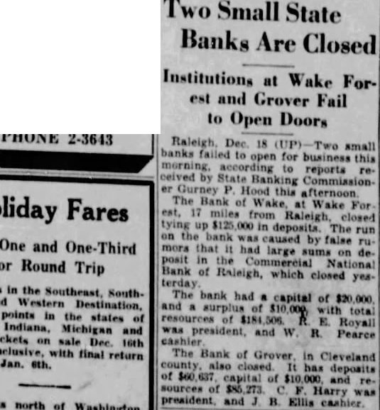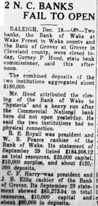 BANKS FAIL TO OPEN Dec. banks, the Bank Wake Wake Forest Wake county and the Bank Grover at Grover Cleveland county, were closed day, Gurney Hood, state commissioner, said this noon. The combined deposits the institutions aggregated about $180,000. Mr. Hood attributed the ing the Bank of Wake and heavy after run the Commercial National did not open yesterday. He said the two institutions had Royall was president and Pearce cashier the Bank of Wake. Its statement September 29 listed total resources, $20,000 capital, $10,000 surplus, and about $120, deposits. president and Elliu cashier the Bank Grover. Its September 29 statement showed $85,273.94 total resources, $10,000 capital about in deposits.
