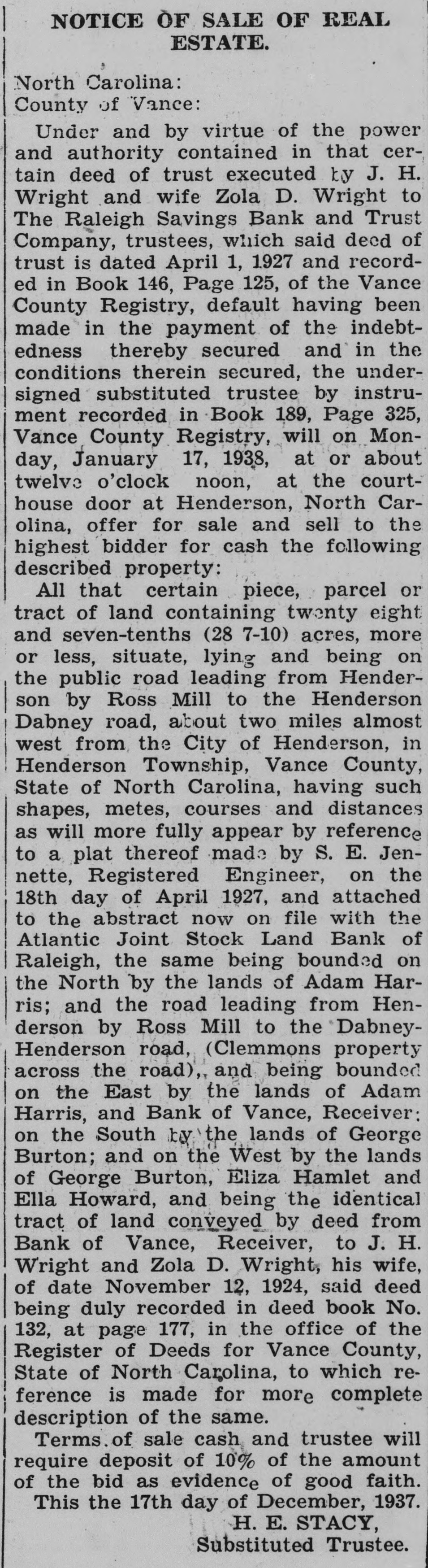 NOTICE OF SALE OF REAL ESTATE. North Carolina: County of Vance: Under and by virtue of the power and authority contained in that certain deed of trust executed by J. H. Wright and wife Zola D. Wright to The Raleigh Savings Bank and Trust Company, trustees, which said decd of trust is dated April 1, 1927 and recorded in Book 146, Page 125, of the Vance County Registry, default having been made in the payment of the indebtedness thereby secured and in the conditions therein secured, the undersigned substituted trustee by instrument recorded in Book 189, Page 325, Vance County Registry, will on Monday, January 17, 1938, at or about twelve o'clock noon, at the courthouse door at Henderson, North Carolina, offer for sale and sell to the highest bidder for cash the following described property: All that certain piece, parcel or tract of land containing twenty eight and seven-tenths (28 7-10) acres, more or less, situate, lying and being on the public road leading from Henderson by Ross Mill to the Henderson Dabney road, about two miles almost west from the City of Henderson, in Henderson Township, Vance County, State of North Carolina, having such shapes, metes, courses and distances as will more fully appear by reference to a plat thereof made by S. E. Jennette, Registered Engineer, on the 18th day of April 1927, and attached to the abstract now on file with the Atlantic Joint Stock Land Bank of Raleigh, the same being bounded on the North by the lands of Adam Harris; and the road leading from Henderson by Ross Mill to the DabneyHenderson road, (Clemmons property across the road), and being bounded on the East by the lands of Adam Harris, and Bank of Vance, Receiver: on the South by the lands of George Burton; and on the West by the lands of George Burton, Eliza Hamlet and Ella Howard, and being the identical tract of land conveyed by deed from Bank of Vance, Receiver, to J. H. Wright and Zola D. Wright, his wife, of date November 12, 1924, said deed being duly recorded in deed book No. 132, at page 177, in the office of the Register of Deeds for Vance County, State of North Carolina, to which reference is made for more complete description of the same. Terms of sale cash and trustee will require deposit of 10% of the amount of the bid as evidence of good faith. This the 17th day of December, 1937. H. E. STACY, Substituted Trustee.