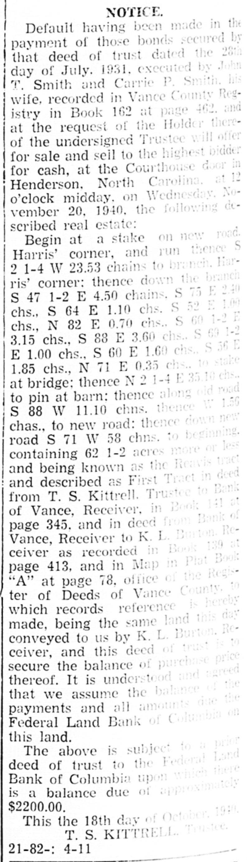 NOTICE. Default having been made in the payment of those bonds secured by that deed of trust dated the 28th day of July, 1931. executed by John T. Smith and Carrie P. Smith. his wife, recorded in Vance County Registry in Book 162 at page 462. and at the request of the Holder thereof the undersigned Trustee will offer for sale and seil to the highest bidder for cash, at the Courthouse door in Henderson. North Carolina, at 12 o'clock midday, on Wednesday, November 20, 1940. the following described real estate: Begin at a stake on new road. Harris' corner, and run thence S 2 1-4 W 23.53 chains to branch. Harris' corner: thence down the branch S 47 1-2 E 4.50 chains, S 75 E 2.40 chs., S 64 E 1.10 chs. S 52 E 1.00 chs., N 82 E 0.70 chs., S 60 1-2 E 3.15 chs., S 88 E 3.60 chs., S 69 1-2 E 1.00 chs., S 60 E 1.60 chs., S 56 E 1.85 chs., N 71 E 0.35 chs.. to stake at bridge: thence N 2 1-4 E 35 10 chs., to pin at barn: thence along old road S 88 W 11.10 chns. thence W 1.56 chas., to new road: thence down new road S 71 W 58 chns. to beginning. containing 62 1-2 acres more or less and being known as the Reavis tract and described as First Tract in deed from T. S. Kittrell. Trustee to Bank of Vance, Receiver, in Book 141 at page 345, and in deed from Bank of Vance, Receiver to K. L. Burton. Receiver as recorded in Book 139 at page 413, and in Map in Plat Book "A" at page 78, office of the Register of Deeds of Vance County, to which records reference is hereby made, being the same land this day conveyed to us by K. L. Burton. Receiver, and this deed of trust is to secure the balance of purchase price thereof. It is understood and agreed that we assume the balance of the payments and all amounts due the Federal Land Bank of Columbia on this land. The above is subject to a prior deed of trust to the Federal Land Bank of Columbia is a balance due $2200.00. This the 18th day of October. 1940. T. S. KITTRELL. Trustee. 21-82-: 4-11