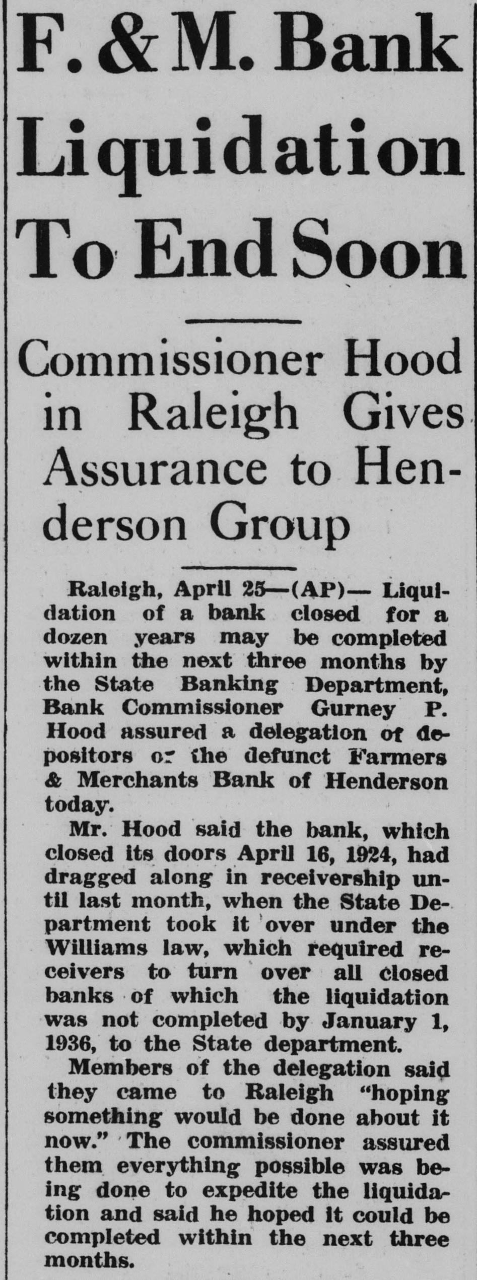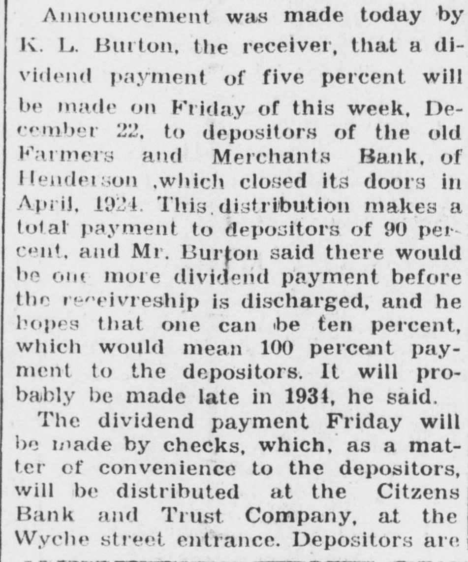 Announcement was made today by K. L. Burton, the receiver, that a dividend payment of five percent will be made on Friday of this week, December 22, to depositors of the old Farmers and Merchants Bank. of Henderson which closed its doors in April, 1924. This distribution makes a total payment to depositors of 90 percent. and Mr. Burton said there would be one more dividend payment before the receivreship is discharged, and he hopes that one can be ten percent, which would mean 100 percent payment to the depositors. It will probably be made late in 1934, he said. The dividend payment Friday will be made by checks, which, as a matter of convenience to the depositors, will be distributed at the Citzens Bank and Trust Company, at the Wyche street entrance. Depositors are