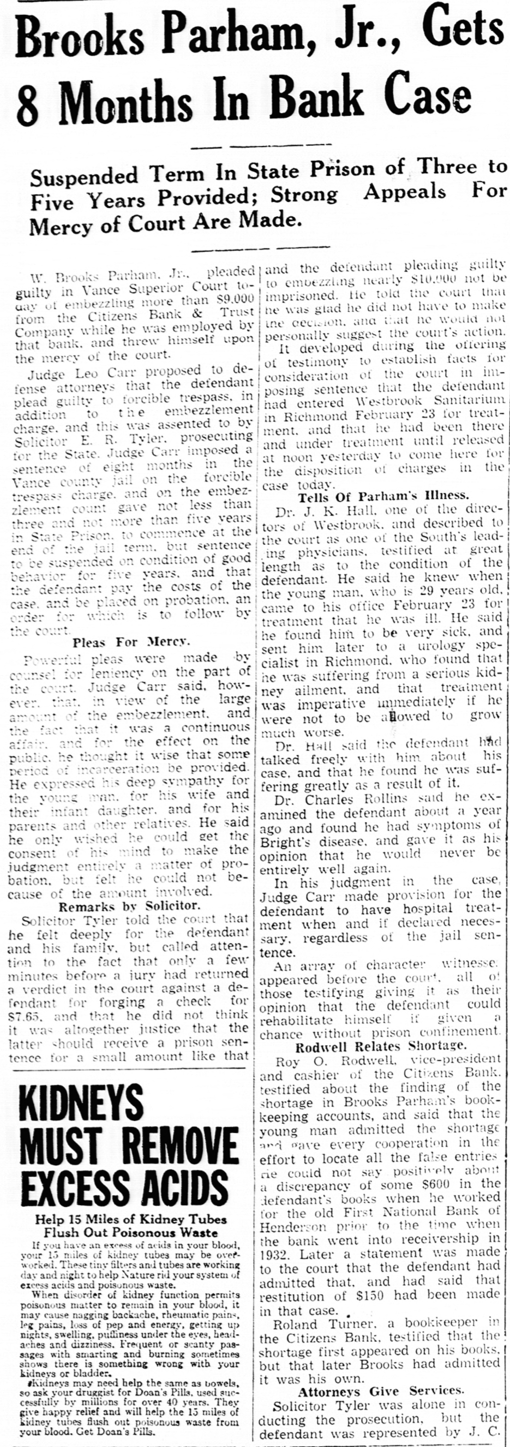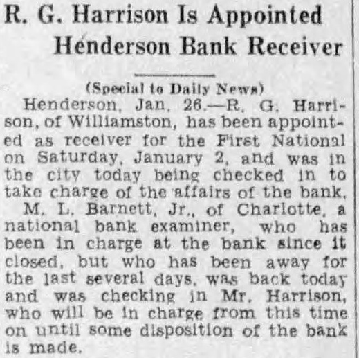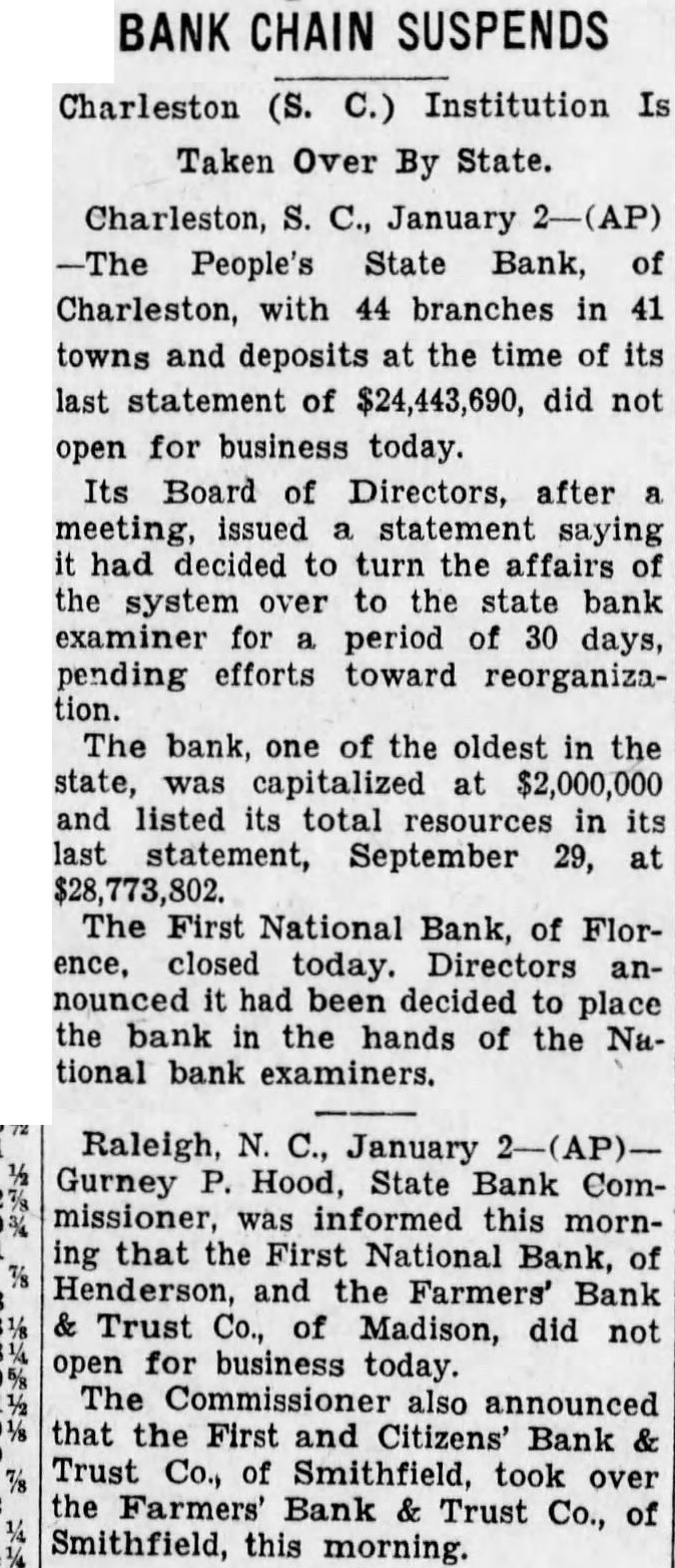 BANK CHAIN SUSPENDS Charleston (S. C.) Institution Is Taken Over By State. Charleston, S. C., January 2-(AP) The People's State Bank, of Charleston, with 44 branches in 41 towns deposits at the time of its last statement of $24,443,690, did not open for business today. Its Board of Directors, after saying had decided turn the affairs the system over the examiner for period of 30 days, pending efforts toward reorganizaThe bank, one of the oldest in the state, was capitalized at $2,000,000 and listed its total resources in its statement, September 29, at $28,773,802. The First National Bank, of Florclosed today. Directors anhad been decided to the bank in the hands of the Na tional bank examiners. Raleigh, N. C., January Gurney P. Hood, State Bank Commissioner, was informed this morning that the First National Bank, of Henderson, and the Farmers' Bank Trust Co., of Madison, did not open for business today. The Commissioner also announced that the First and Citizens' Bank Trust Co., of Smithfield. took over the Bank & Trust Co., of Smithfield, this morning.
