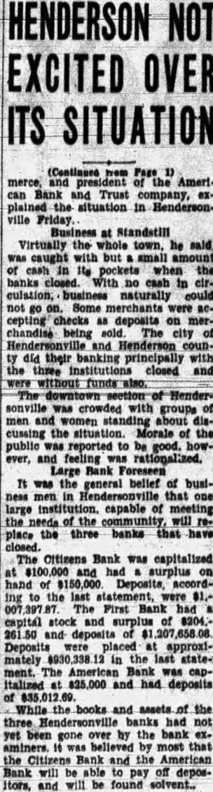 HENDERSON NOT EXCITED OVER ITS SITUATION (Continued and president American Bank and Trust company, exsituation in Hendersonville Friday at Standstill Virtually the whole he was caught with small amount no cash naturally not on. Some were cepting as deposits on merchandise city and Henderson did banking principally with the closed were without sonville crowded with groups men and women about cussing the Morale of the public was reported be ever, and feeling was rationalized. Bank Foreseen It was the general belief of men that large capable of the community the The Citizens Bank was capitalized $100,000 surplus hand $150,000 the last statement First had capital stock and and Deposits mately ment. The American cap$25,000 and had deposits of While the books and of the three Hendersonville banks had not yet been over the bank aminers. believed by most the Citizens and the Bank will pay off depositors, and will be solvent..