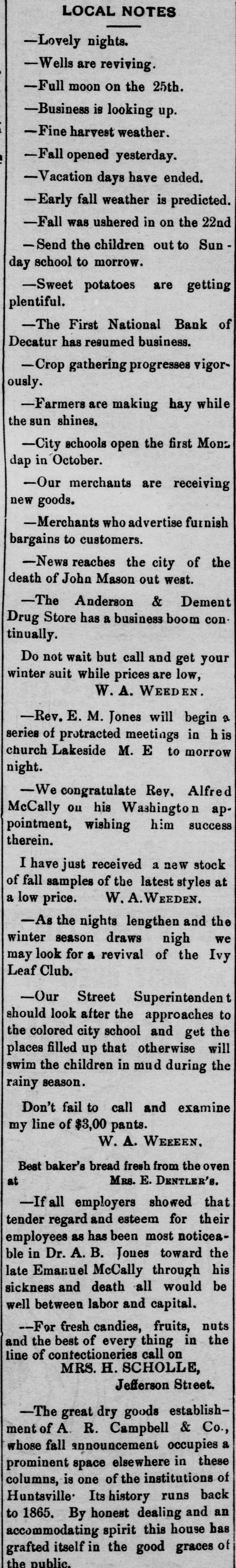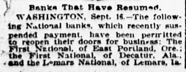 Banks That Have Resumed. WASHINGTON, Sept. 16.-The following National banks, which recently suspended payment. have been permitted to reopen their doors for business: The First National, of East Portland, Ore.; the First National, of Decatur, Ala., and the Lemars National, of Lemars, la.
