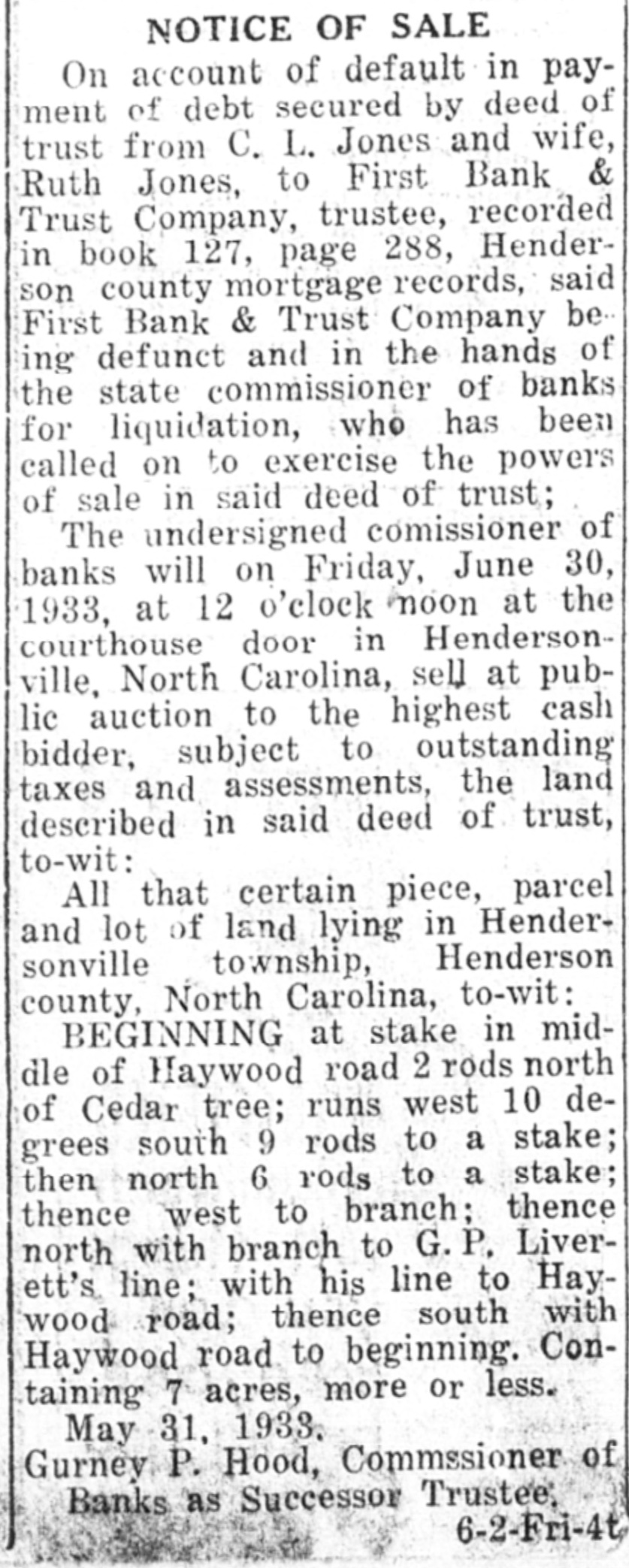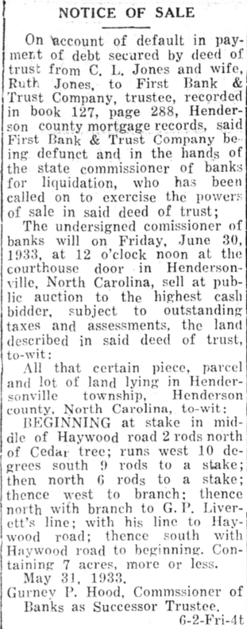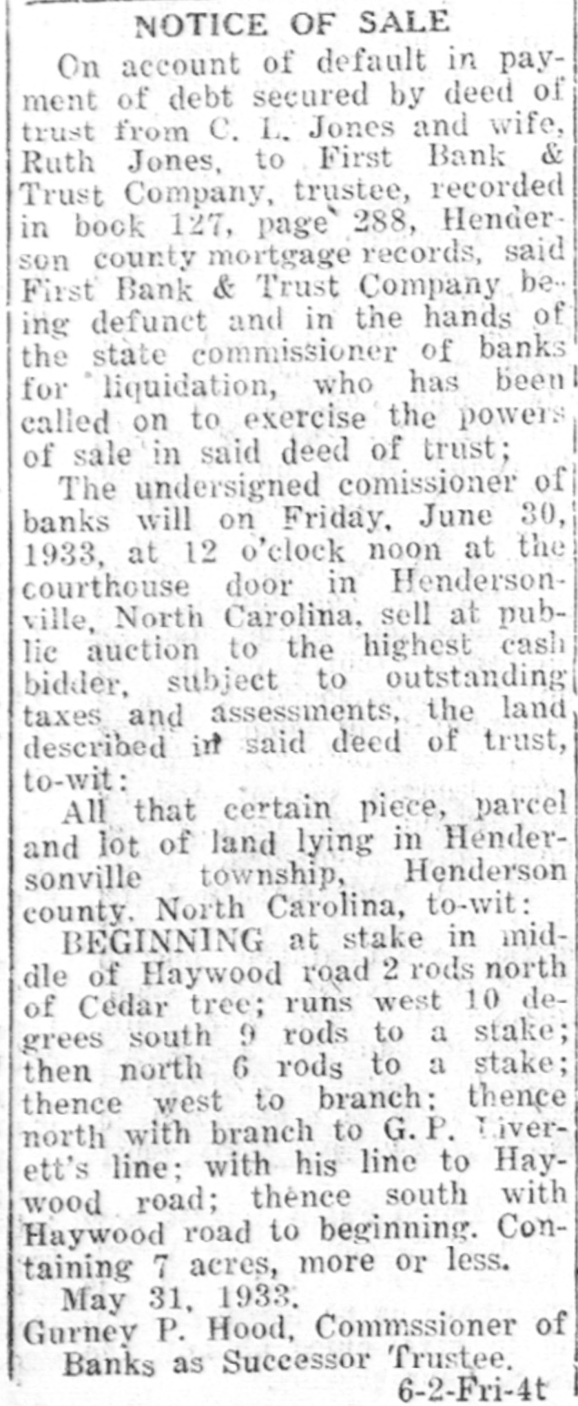 NOTICE OF SALE On account of default in payment of debt secured by deed of trust from C. L. Jones and wife, Ruth Jones, to First Bank & Trust Company, trustee, recorded in book 127, page 288, Henderson county mortgage records, said First Bank & Trust Company be ing defunct and in the hands of the state commissioner of banks for liquidation, who has been called on to exercise the powers of sale in said deed of trust; The undersigned comissioner of banks will on Friday, June 30, 1933, at 12 o'clock noon at the courthouse door in Hendersonville, North Carolina, sell at public auction to the highest cash bîdder, subject to outstanding taxes and assessments, the land described in said deed of trust, to-wit: All that certain piece, parcel and lot of land lying in Hendersonville township, Henderson county, North Carolina, to-wit: BEGINNING at stake in middle of Haywood road 2 rods north of Cedar tree; runs west 10 degrees south 9 rods to a stake; then north 6 rods to a stake; thence west to branch; thence north with branch to G.P. Liverett's line; with his line to Haywood road; thence south with Haywood road to beginning. Containing 7 acres, more or less. May 31, 1933. Gurney P. Hood, Commssioner of Banks as Successor Trustee. 6-2-Fri-4t