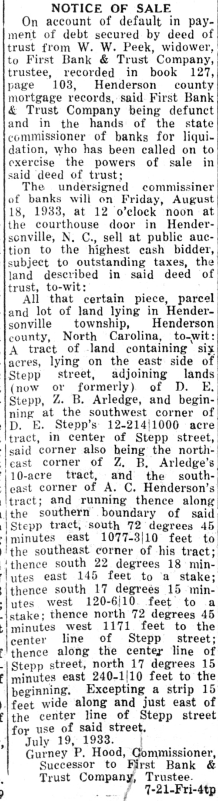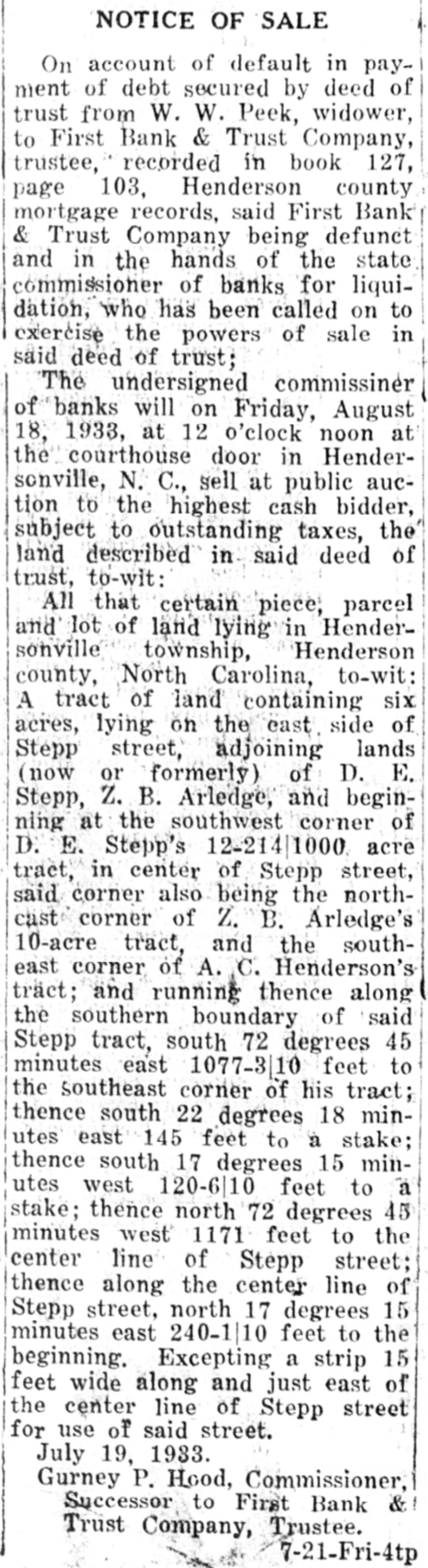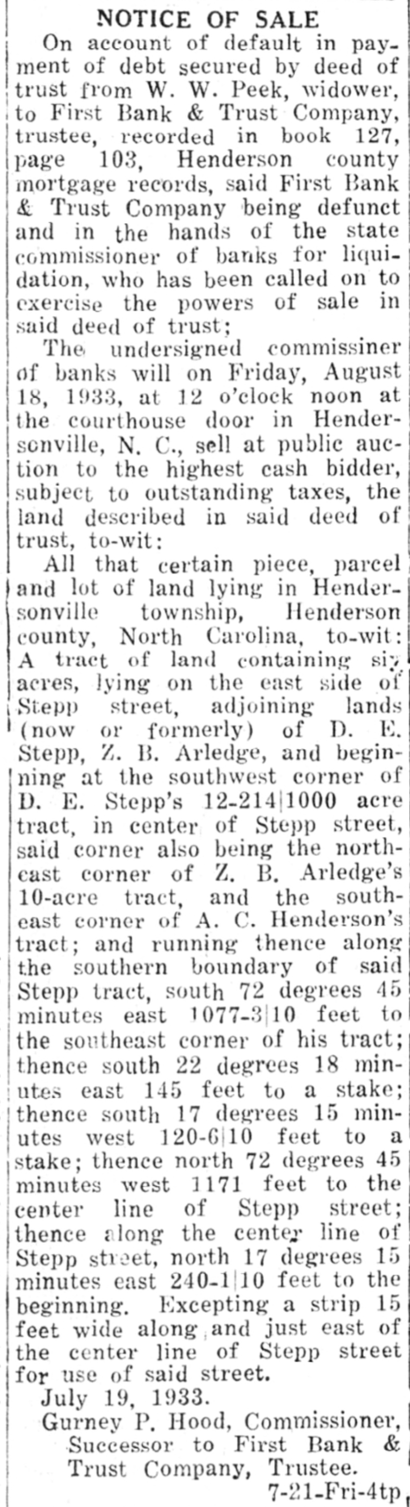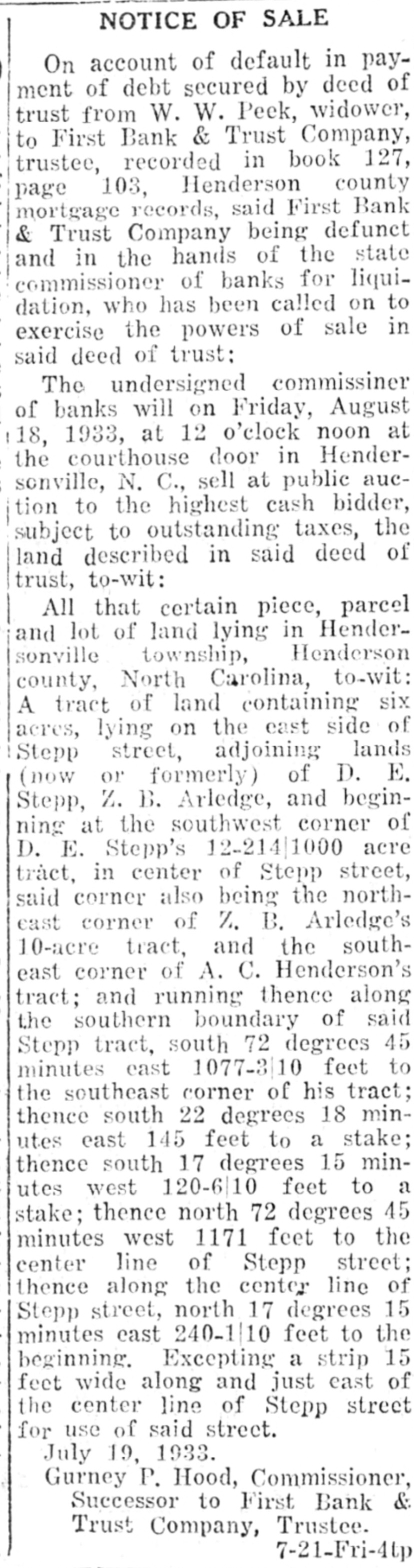 NOTICE OF SALE On account of default in payment of debt secured by deed of trust from W. W. Peek, widower, to First Bank & Trust Company, trustee, recorded in book 127, page 103, Henderson county mortgage records, said First Bank & Trust Company being defunct and in the hands of the state commissioner of banks for liquidation, who has been called on to exercise the powers of sale in said deed of trust; The undersigned commissiner of banks will on Friday, August 18, 1933, at 12 o'clock noon at the courthouse door in Hendersonville, N. C., sell at public auction to the highest cash bidder, subject to outstanding taxes, the land described in said deed of trust, to-wit: All that certain piece, parcel and lot of land lying in Hendersonville township, Henderson county, North Carolina, to-wit: A tract of land containing six acres, lying on the east side of Stepp street, adjoining lands (now or formerly) of D. E. Stepp, Z. B. Arledge, and beginning at the southwest corner of D. E. Stepp's 12-214 I 1000 acre tract, in center of Stepp street, said corner also being the northeast corner of Z. B. Arledge's 10-acre tract, and the southeast corner of A. C. Henderson's tract; and running thence along the southern boundary of said Stepp tract, south 72 degrees 45 minutes east 1077-3|10 feet to the southeast corner of his tract; thence south 22 degrees 18 minutes east 145 feet to a stake; thence south 17 degrees 15 minutes west 120-6/10 feet to a stake; thence north 72 degrees 45 minutes west 1171 feet to the center line of Stepp street; thence along the center line of Stepp street, north 17 degrees 15 minutes east 240-1/10 feet to the beginning. Excepting a strip 15 feet wide along and just east of the center line of Stepp street for use of said street. July 19, 1933. Gurney P. Hood, Commissioner, Successor to First Bank & Trust Company, Trustee. 7-21-Fri-4tp