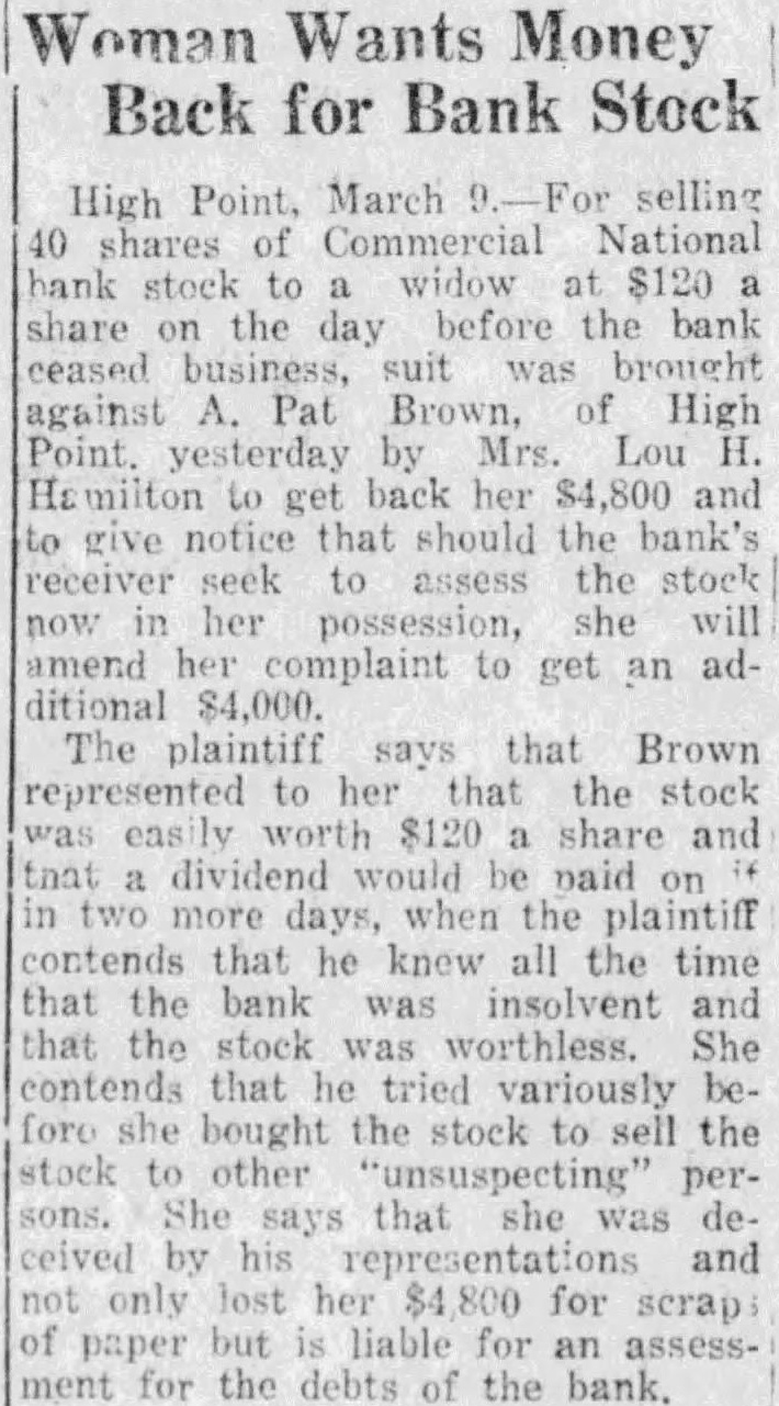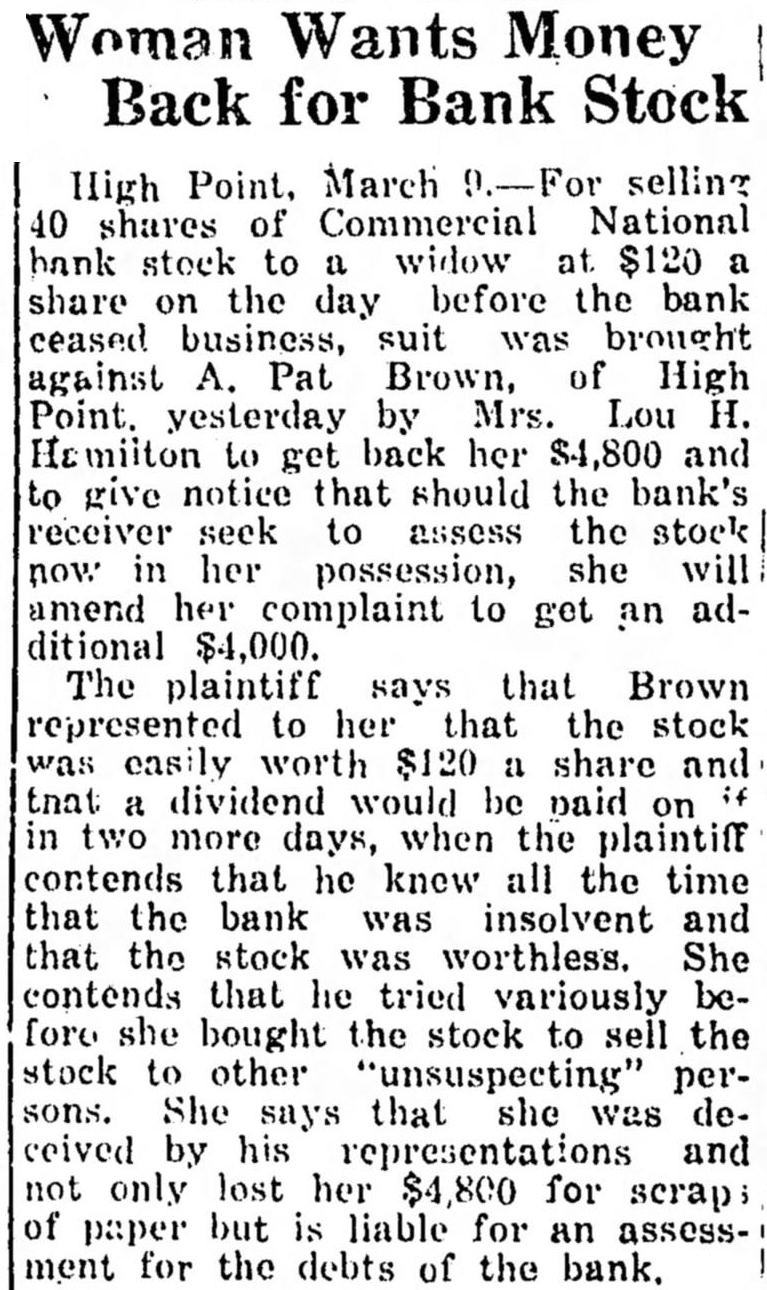 High March selling 40 shares of Commercial National stock to widow at $120 share on the day before the bank ceased business, suit was brought against A. Pat Brown, of High Point. yesterday by Mrs. Lou H. to get back her $4,800 and give notice that should the bank's receiver seek assess the stock in her possession, she will now amend her complaint to get adan $4,000. The plaintiff says that Brown represented to her that the stock worth $120 share and that dividend would be contends that he knew all the time that the stock was worthless. She stock to other peronly lost her $4,800 for of but liable for an paper ment for the debts of the bank.