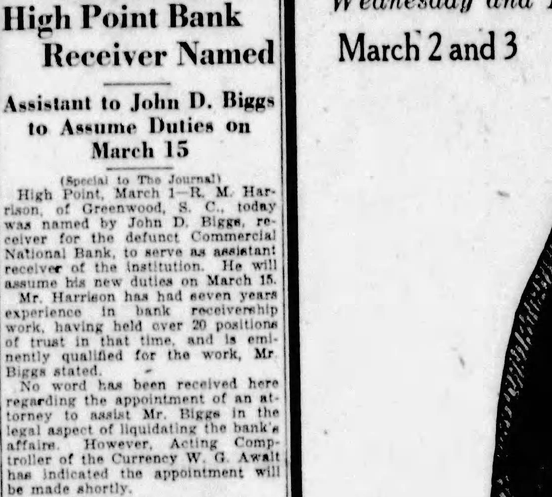 (Special The Journal) High March Greenwood, today John for the defunct Commercial National Bank, to serve as assistant of the He receiver his duties on March Mr. has had seven years experience bank held over 20 positions of trust and qualified for the work, Mr Biggs has been received here regarding the to assist Biggs in the torney of the legal Acting troller of the has appointment will be made shortly