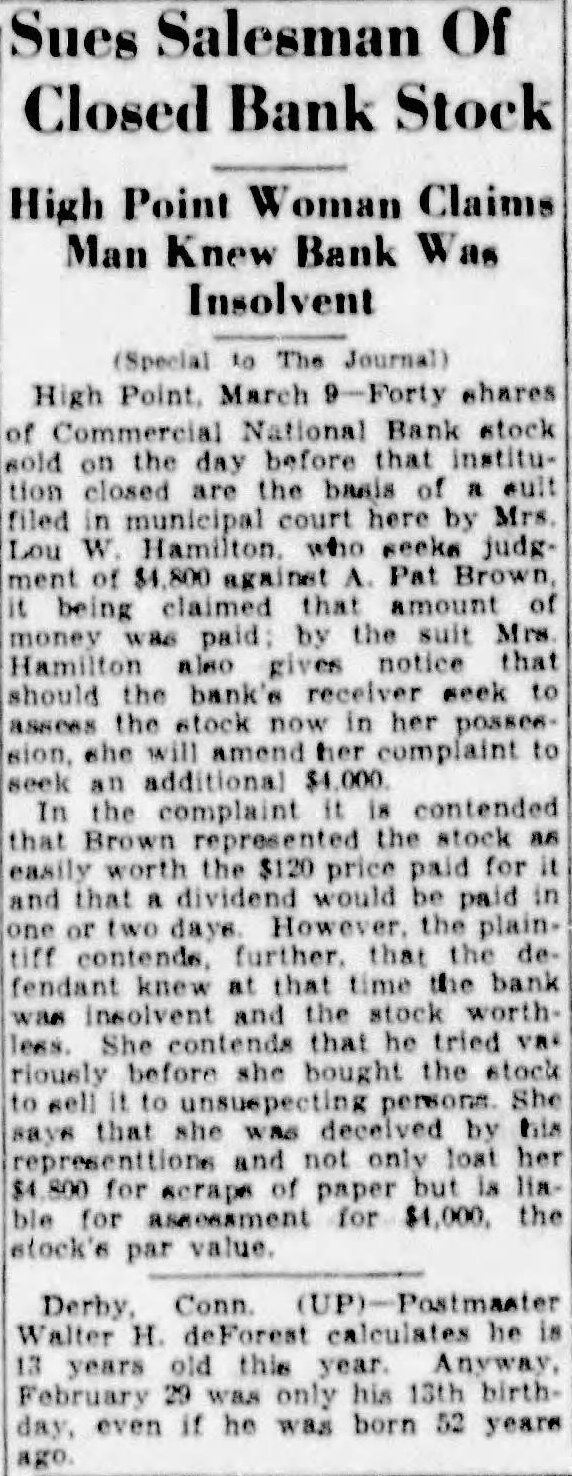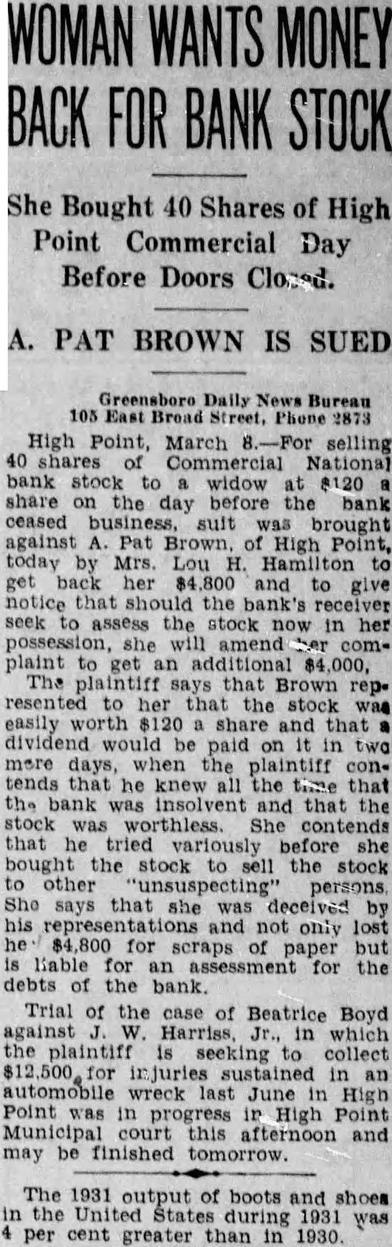 Greensboro Daily News Bureau 105 East 2873 High Point, March selling 40 shares Commercial National bank stock to widow at $120 share on the day before the bank ceased business, suit was brought against Pat Brown, High Point, today Mrs. Lou H. Hamilton to get back her $4,800 and to give should the bank's receiver seek to assess the stock in her possession, she amend plaint to get an additional $4,000, The plaintiff says that Brown rep. resented her that the stock was easily $120 share and that dividend would be paid two more days, when the plaintiff contends that he knew all the time that the bank was insolvent and that the stock was worthless. She contends that he tried variously before she bought the stock to sell the stock to other She says that she was deceived by his representations and not only lost he $4,800 for scraps of paper but is Gable for an assessment for the debts the bank. Trial of the case of Beatrice Boyd against Harriss, in which the plaintiff seeking to collect 500 sustained in an automobile wreck last June High Point in progress High Point Municipal court this afternoon and may be finished tomorrow