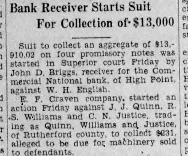 Suit to collect an aggregate of $13, 910.02 on four notes was court Friday by started John D. Briggs, receiver for the Commercial National bank, of High Point, against W. H. English started Friday against Quinn. ing as Quinn, Williams and Justice. $231 Rutherford collect alleged to be due for machinery sold to defendants.