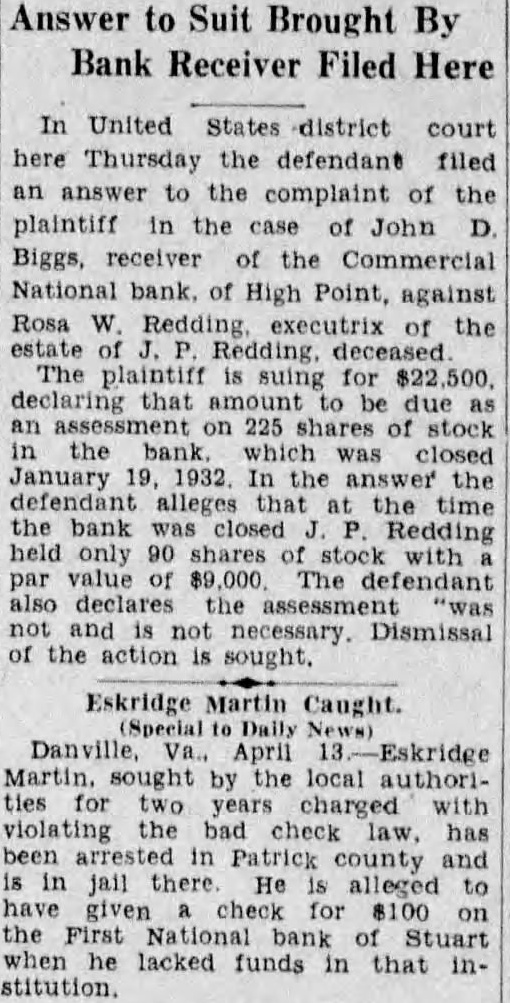 In United States district court here Thursday the defendant filed an answer the complaint of the plaintiff in the case John Biggs, receiver the Commercial National bank. of High Point, against Rosa Redding, executrix of the deceased The plaintiff suing for $22,500. declaring that amount be due an 225 shares stock the which closed January 1932 defendant that the the bank closed Redding held only 90 shares stock value $9,000. defendant declares not necessary. Dismissal the