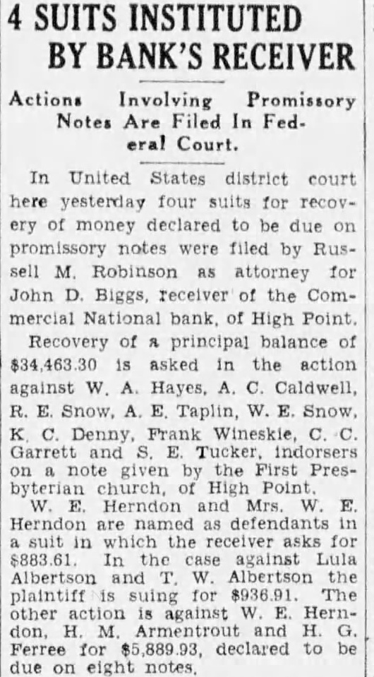 In United States district court here yesterday four suits for recovery of money declared to be due on promissory notes were filed by Russell M. Robinson attorney for John D Biggs, receiver of the Commercial National bank, of High Point. Recovery of & principal balance of $34 463 is asked in the action against W. A. Hayes, A. C. Caldwell, R. E. Snow, A. E. Taplin, W. E. Snow, C. Denny Frank Wineskie, C. C. Garrett and S. Tucker on note given the First Presbyterian church, of High Point E. Herndon and Mrs. E. Herndon are as defendants in suit in the asks for $883.61 the case against Lula Albertson and W. Albertson the plaintiff suing for $936.91 The other action is against E. Herndon, H. M. Armentrout and H. G. Ferree for declared to be due on eight