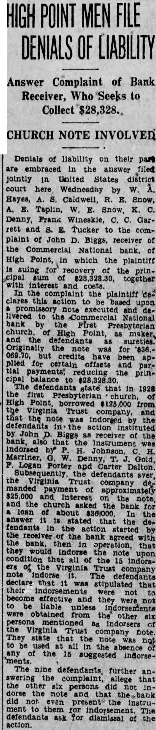 Denials of liability on their part are in the answer filed jointly in United States district Wednesday Hayes, Caldwell, Snow, Taplin, Denny, Frank Wineskie, Garrett Tucker to the complaint of John Biggs, receiver the Commercial National bank, of High Point, in which the plaintiff for the $28,328.30, together interest In complaint the plaintiff clares this action livered the National bank church High and the Originally the for but credits plied for offsets and reducing prinbalance $28,328.30. defendants state 1928 the Presbyterian borrowed $125,000 Virginia Trust the was indorsed John Biggs the was indorsed Marriner, Denny Carter defendants the Virginia Trust company $25,000 and the on the church asked loan about the answer the fendants action started bank with that condition all indorsers the Virginia defendants that was stipulated that not become effective and they not were obtained from the other persons mentioned indorsers They Trust company note the note any the 15 suggested indorseThe nine defendants, further answering the that the persons the and present instrudefendants ask for dismissal the action.