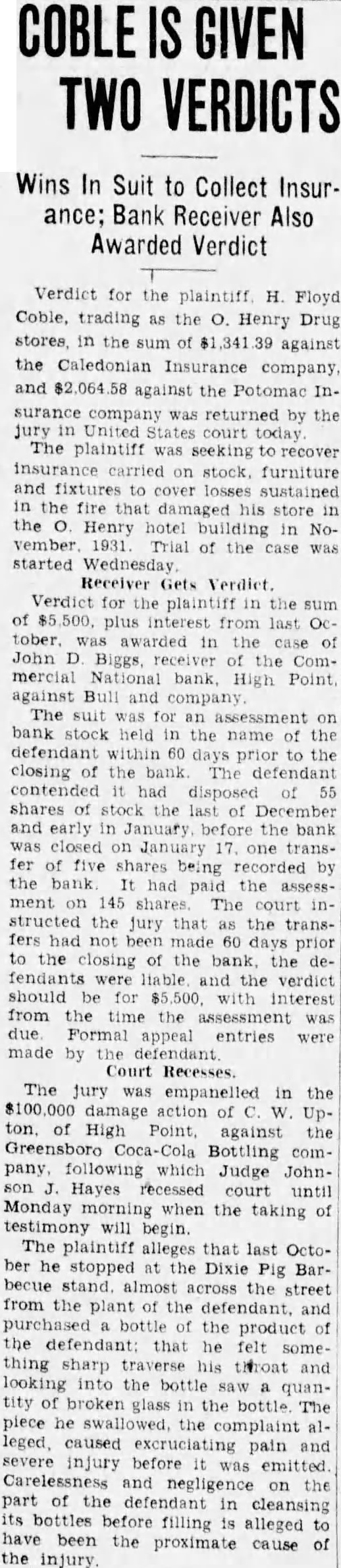 Verdict for the plaintiff H. Floyd Coble, trading as the O. Henry Drug stores, in the sum of $1,341 39 against the Caledonian Insurance company, and $2,064 against the Potomac Insurance company was returned by the jury United States court today The plaintiff was seeking recover insurance carried on stock, furniture and to cover sustained in the fire that damaged his store the Henry hotel in November 1931 Trial of the case was started Wednesday Verdict for the plaintiff the sum of plus interest from last October. was awarded in the case of John D Biggs, of the Commercial National bank High Point. against Bull and company The suit was for assessment on bank stock held in the name of the defendant within 60 days prior to the closing the bank. The defendant contended had disposed of 55 shares of stock the last of December and early in January the bank was closed on one transfer of five shares being by the bank had paid the ment on 145 shares The instructed the jury that as the transfers had not 60 days prior to the closing of the bank, the defendants were liable and the verdict should be for $5,500, with interest from the time the assessment was due Formal appeal entries were made by defendant Court The jury empanelled in the $100,000 damage action of Upton. of High Point. against the Greensboro Bottling company, following which Judge Johnson Hayes recessed court until Monday when the taking of testimony will begin. The plaintiff alleges that last October he stopped the Dixie Pig Barbecue stand. almost across the street from the plant the and purchased bottle of the product of the defendant: that he felt some thing sharp his throat and looking into the bottle saw quantity broken the bottle The piece he swallowed. the complaint leged, caused excruciating pain and severe injury before was emitted. Carelessness and negligence on the part of defendant in cleansing its bottles before filling is alleged to have been the proximate cause of the injury