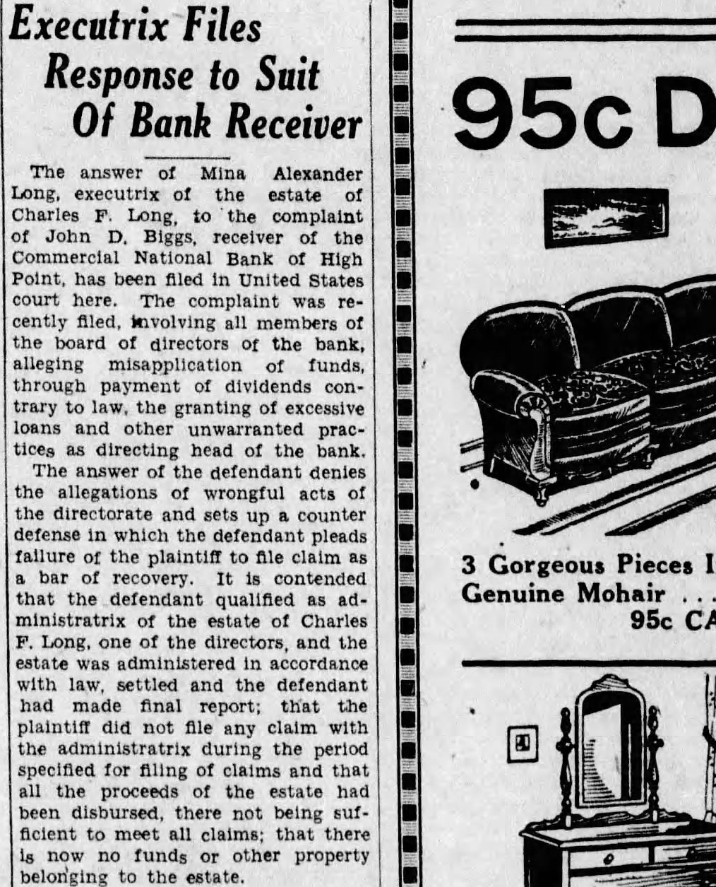 The answer of Mina Alexander Long, executrix of the estate of Charles F. Long, to the complaint of John D. Biggs, receiver of the Commercial National Bank of High Point, has been filed in United States court here. The complaint was recently filed, involving all members of the board of directors of the bank, alleging misapplication of funds, through payment of dividends contrary to law, the granting of excessive loans and other unwarranted practices as directing head of the bank. The answer of the defendant denies the allegations of wrongful acts of the directorate and sets up counter defense in which the defendant pleads failure of the plaintiff to file claim as 3 Gorgeous Pieces In bar of recovery. It is contended Genuine Mohair that the defendant qualified as administratrix of the estate of Charles F. Long, one of the directors, and the estate was administered in accordance with law, settled and the defendant had made final report; that the plaintiff did not file any claim with the administratrix during the period specified for filing of claims and that all the proceeds of the estate had been disbursed, there not being sufficient to meet all claims; that there is now no funds or other property belonging to the estate.