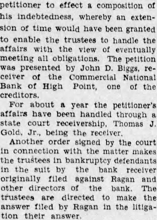 petitioner to effect a composition of his indebtedness, whereby an extension of time would have been granted to enable the trustees to handle the affairs with the view of eventually meeting all obligations. The petition was presented by John D. Biggs, receiver of the Commercial National Bank of High Point, one of the creditors. For about a year the petitioner's affairs have been handled through state court receivership. Thomas J. Gold, Jr., being the Another order signed by the court in connection with the makes the trustees in bankruptcy defendants in the suit by the bank receiver originally filed against Ragan and other of the bank. The trustees are directed to make the answer filed by Ragan in the litigation their answer