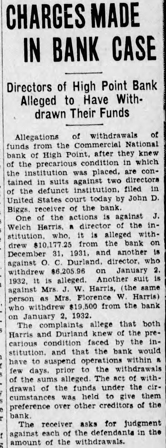 Directors of High Point Bank Alleged to Have Withdrawn Their Funds of withdrawals of Allegations funds the Commercial National bank of High Point, after they knew of the precarious condition in which the institution placed, are contained in suits against directors of the defunct institution. filed in United States court today by John D. Biggs. receiver of the bank One of the actions against J. Welch Harris, director of the institution it alleged from bank on drew December 31, 1931, and another C. Durland. who against $6,205.96 January withdrew Another is alleged. against Mrs. W. Harris, (the same person Mrs. Florence W Harris) withdrew $19,500 from the bank who January 1932. The complaints allege that both Harris Durland knew of the precarious condition faced by the stitution. that bank would have to suspend operations within few days. prior to the withdrawals of the sums alleged. The act of withdrawal of the funds under the circumstances was held to give them preference over other creditors of the bank. The receiver asks for judgment against each of the defendants in the amount of the withdrawals.
