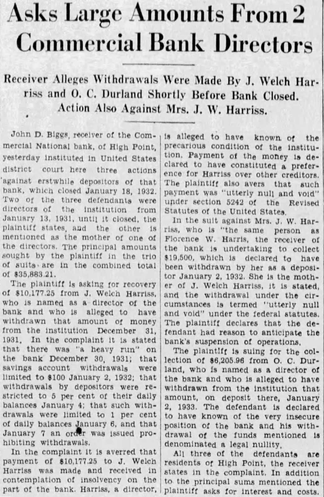 John D. Biggs, receiver of the Com- mercial National bank, of High Point, yesterday instituted in United States district court three actions against erstwhile depositors of that bank, which January 18, 1932. Two the three defendants were directors of the institution from January 1931, until closed. the plaintiff states, the other mentioned as the mother one the directors. principal amounts sought by plaintiff the combined total The is asking for recovery from Welch who named director of the bank alleged have that money the 31, the stated that on the bank that savings limited $100 January 1932; that by stricted per cent their balances such drawals cent daily January and that January was issued proIn the complaint averred that of $10,177.25 Welch Harriss and received contemplation on the part of the bank. Harriss, director, alleged to have known the precarious the institution. Payment the declared have preferfor Harriss other The plaintiff also that such "utterly void" under the Revised Statutes United States In the suit against Mrs. Harriss, who same person Florence Harris, the receiver bank collect which declared to have withdrawn her depositor January She is the mothWelch Harriss, stated, and the withdrawal under the cumstances termed "utterly null and the federal statutes. The plaintiff declares the defendant reason anticipate the suspension of operations. The suing for the collection $6,205.96 Durland, who named director the bank who alleged have withdrawn the institution that amount, deposit there, January 1933. declared known the very insecure position the bank and his withdrawal the funds All three the defendants are High Point, the receiver states In addition to the the plaintiff asks for interest and costs.