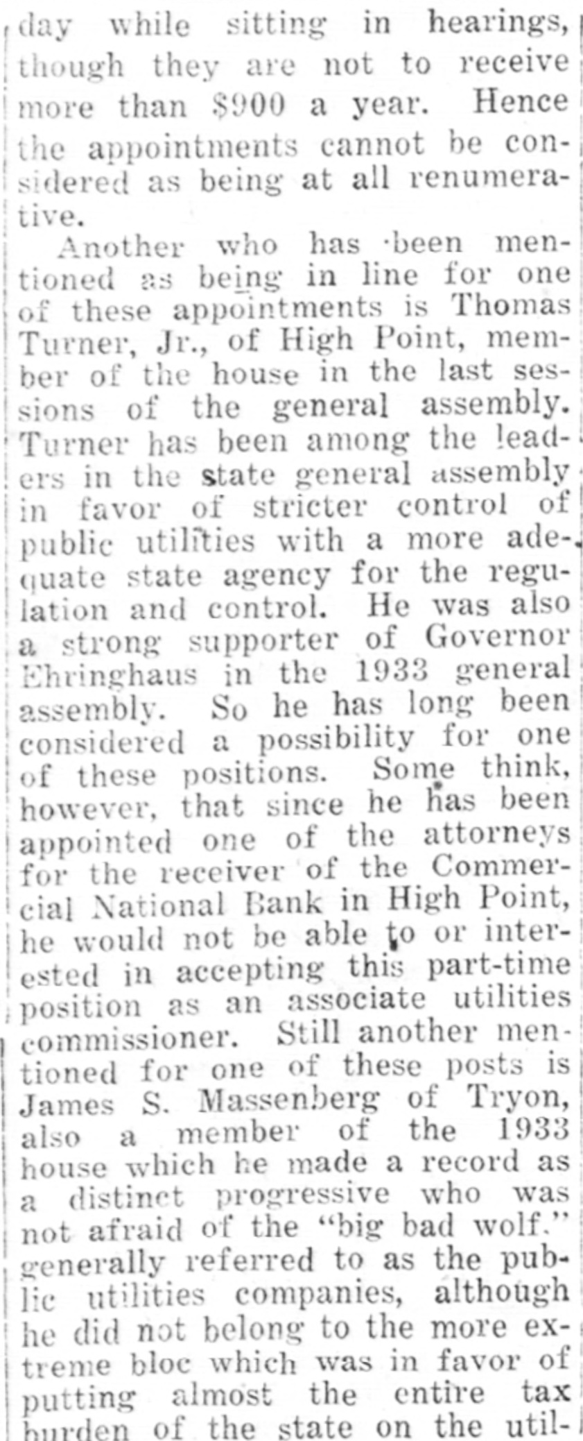 Another who has been mentioned as being in line for one of these appointments is Thomas Turner, Jr., of High Point, member of the house in the last sessions of the general assembly. Turner has been among the leaders in the state general assembly in favor of stricter control of public utilities with a more adequate state agency for the regulation and control. He was also a strong supporter of Governor Ehringhaus in the 1933 general assembly. So he has long been considered a possibility for one of these positions. Some think, however, that since he has been appointed one of the attorneys for the receiver of the Commercial National Bank in High Point, he would not be able to or interested in accepting this part-time position as an associate utilities commissioner. Still another mentioned for one of these posts is James S. Massenberg of Tryon, also a member of the 1933 house which he made a record as a distinct progressive who was not afraid of the "big bad wolf," generally referred to as the public utilities companies, although he did not belong to the more extreme bloc which was in favor of putting almost the entire tax burden of the state on the util-