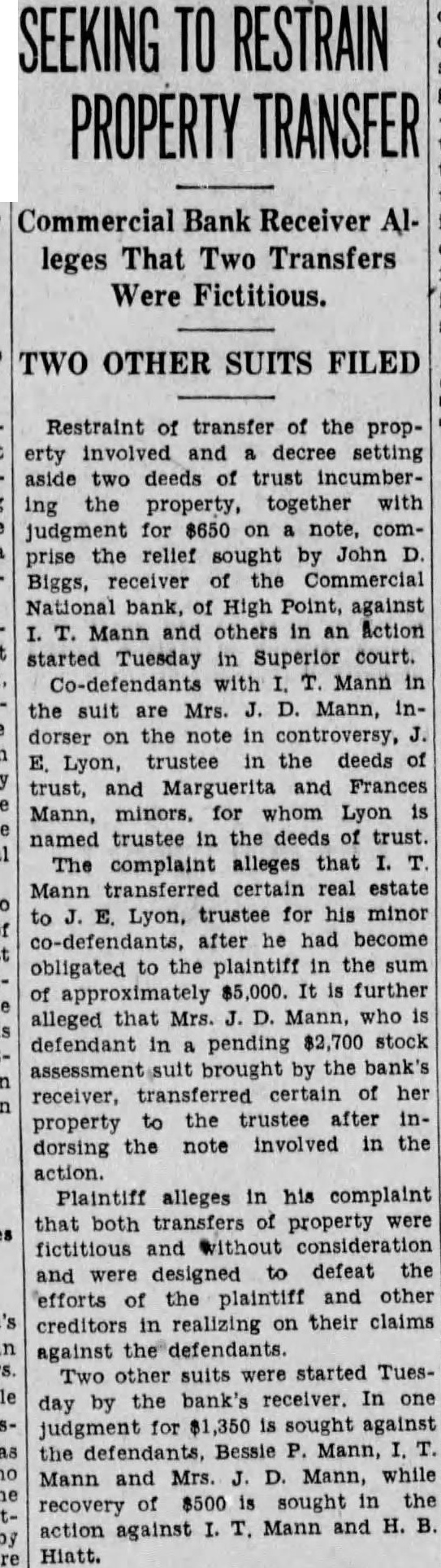 Restraint of transfer of the property involved and decree setting aside two deeds trust incumbering the property, together with judgment for note, comprise relief sought John Biggs, receiver Commercial National bank, High Point, against Mann and others an Action started Tuesday in Superior court. Co-defendants Mann in the are Mrs. Mann, on the in controversy, E. Lyon, trustee the deeds of trust, and Marguerita and Frances Mann, Lyon named trustee the deeds trust. The complaint alleges that Mann certain real estate to Lyon, for his minor co-defendants, after he had become obligated to the plaintiff in the $5,000. is further alleged that Mann, defendant pending stock brought the bank's receiver, transferred her property the trustee after inthe note involved in the dorsing action. Plaintiff alleges in his complaint that both transfers property were fictitious and without consideration defeat the and designed efforts the plaintiff and other creditors in realizing on their claims against Two other suits started Tuesday by the bank's receiver. In one for is sought against the defendants, Bessie Mann, Mann Mrs. Mann, while $500 sought in the recovery action against Mann and H. Hiatt.